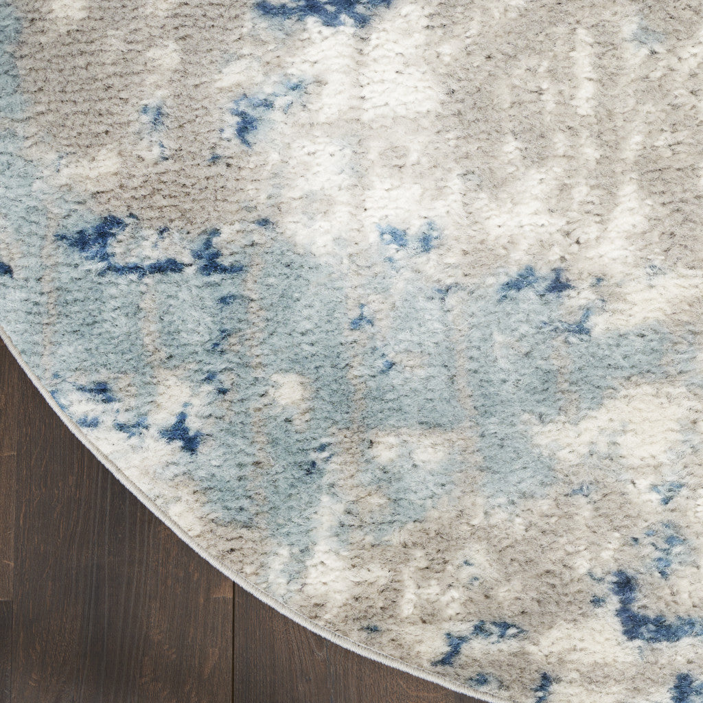 Add great coloration and comfortable texture to your space with this 5' blue and gray round abstract power loom area rug. This geometric round shaped rug features a abstract pattern in blue and gray that combines a good looking print with a unique and updated shape. The mix of shape, color, and design gives this rug refreshing visual interest. Made in Turkey, this rug offers high quality combined with good looking designer sensibilities. Place this area rug against a hardwood or tile floor and it will enliven your living space with style and sophistication. .32" H x 63.00" W x 63.00" D