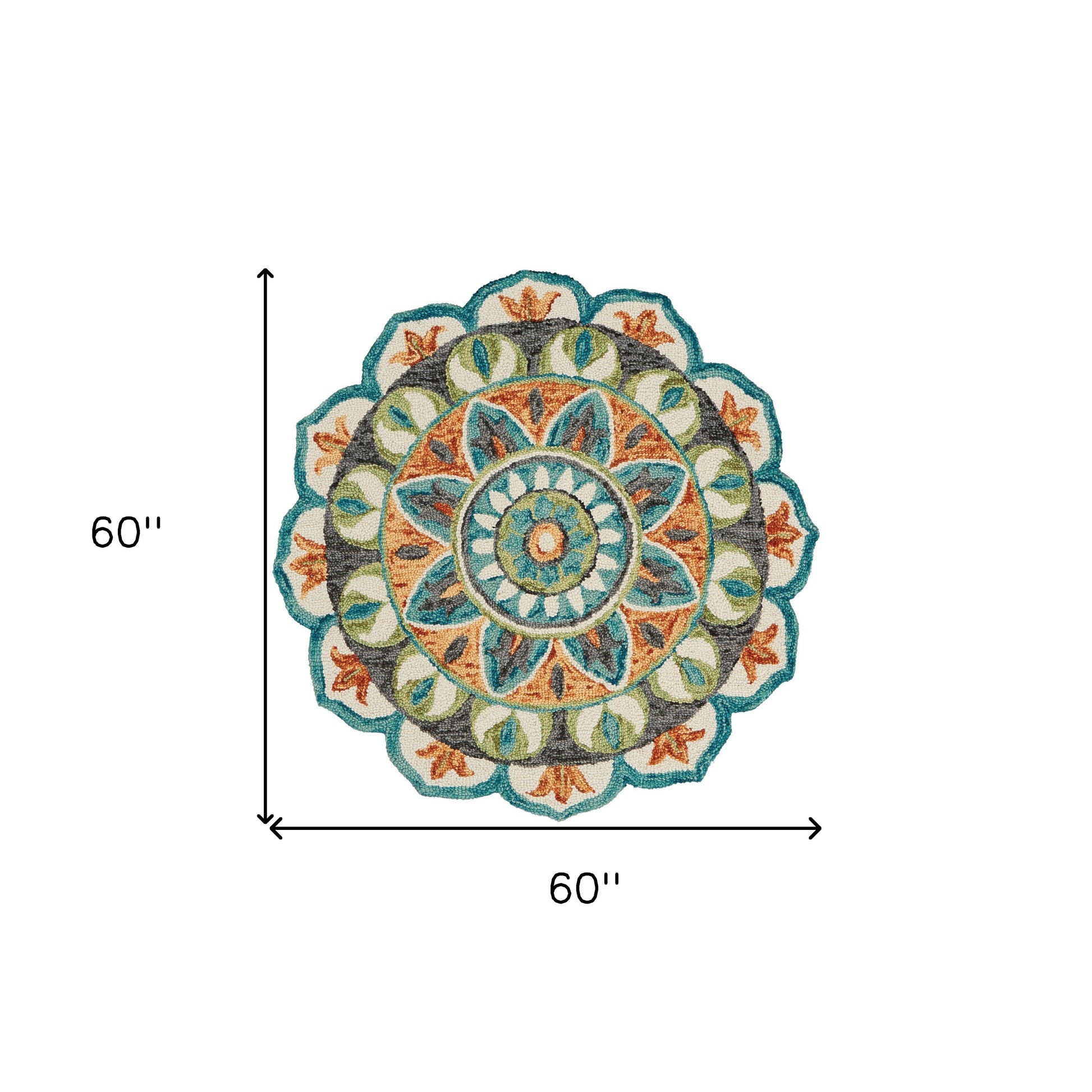 5' Blue and Ivory Round Wool Floral Hand Tufted Area Rug