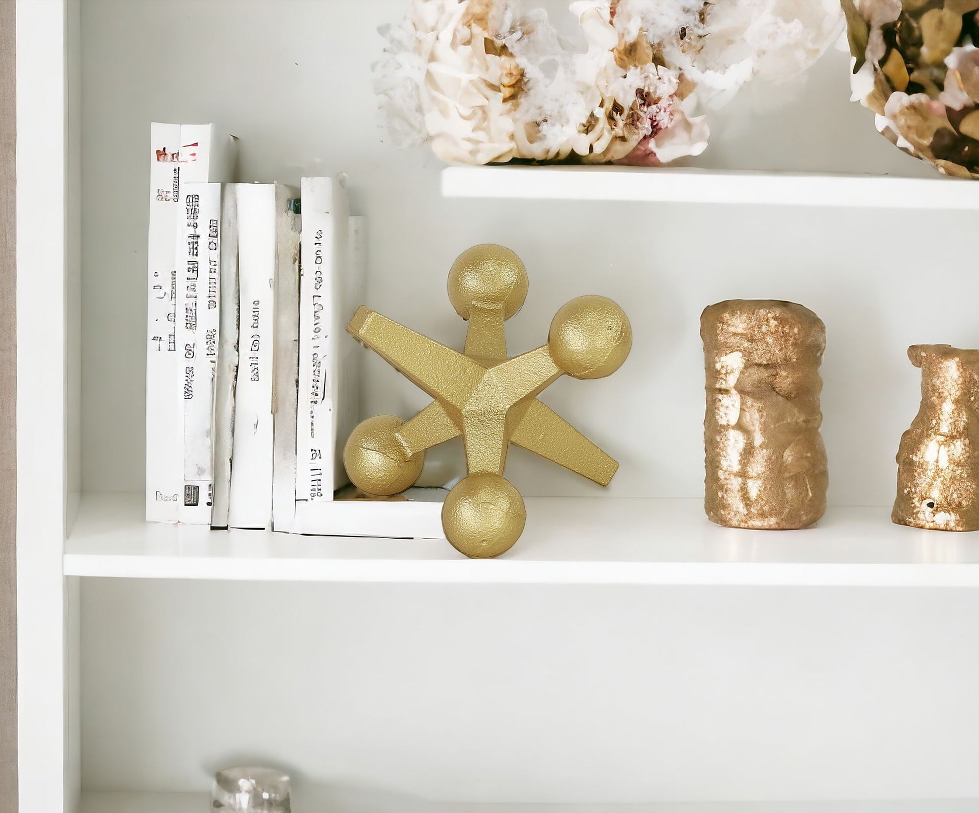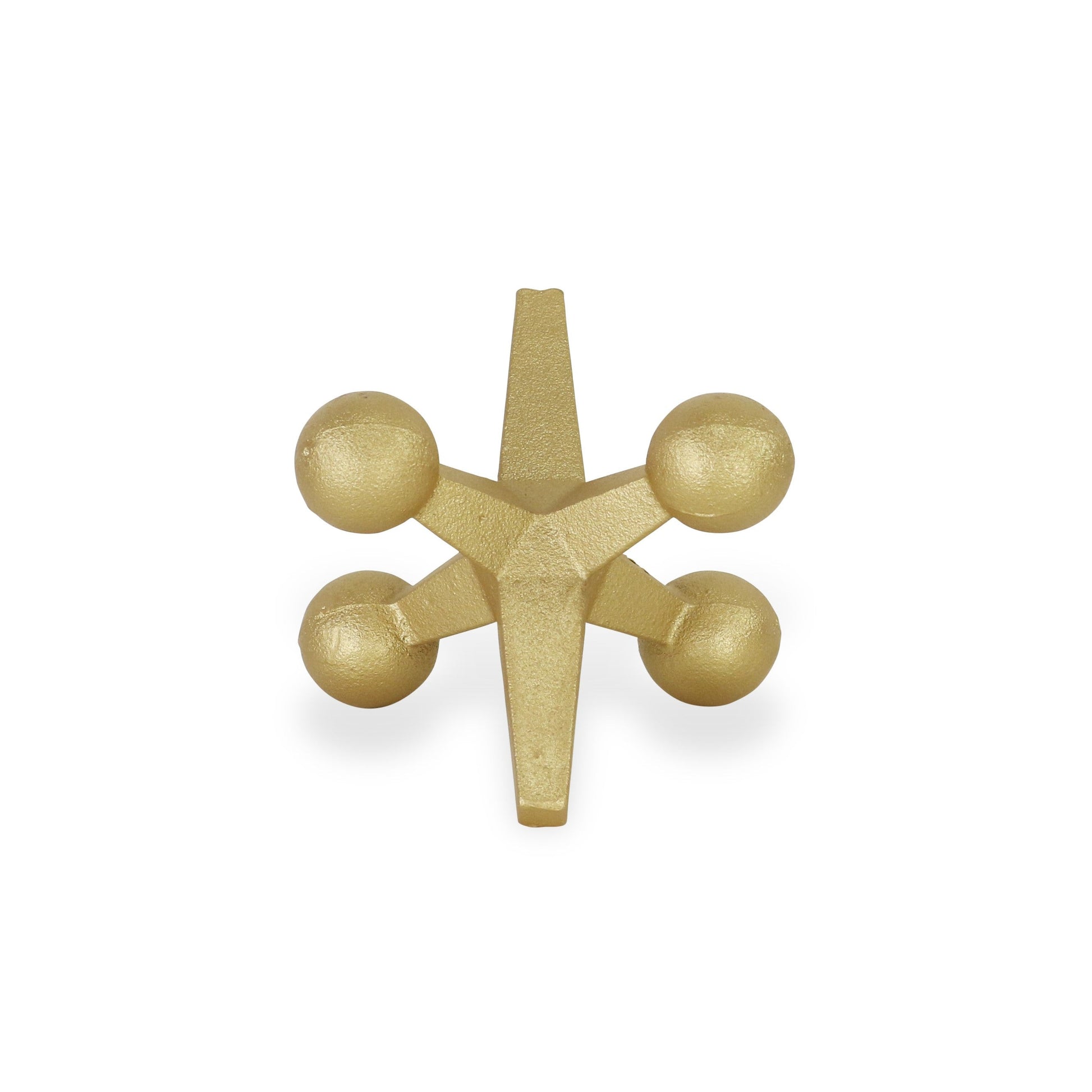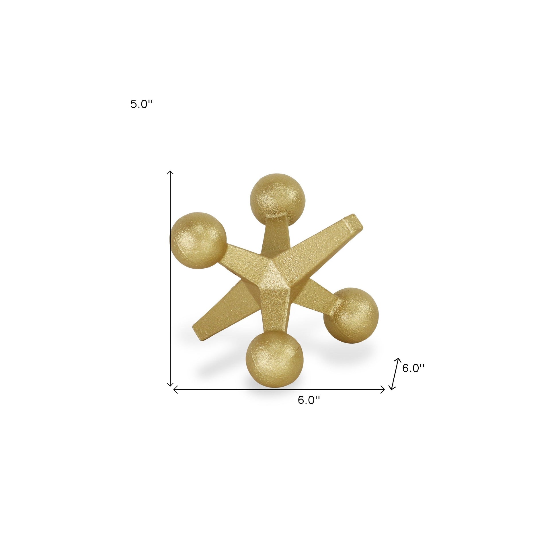 Add an air of fashion to your room and rejuvenate the space with this 5-inch gold metal game hand painted game. This oversized tabletop sculpture of a toy jack is a fun and decorative way to accent your space. It's a perfect addition for those who love an up-to-the-minute look and feel. 5-inch H x 6-inch W x 6-inch D