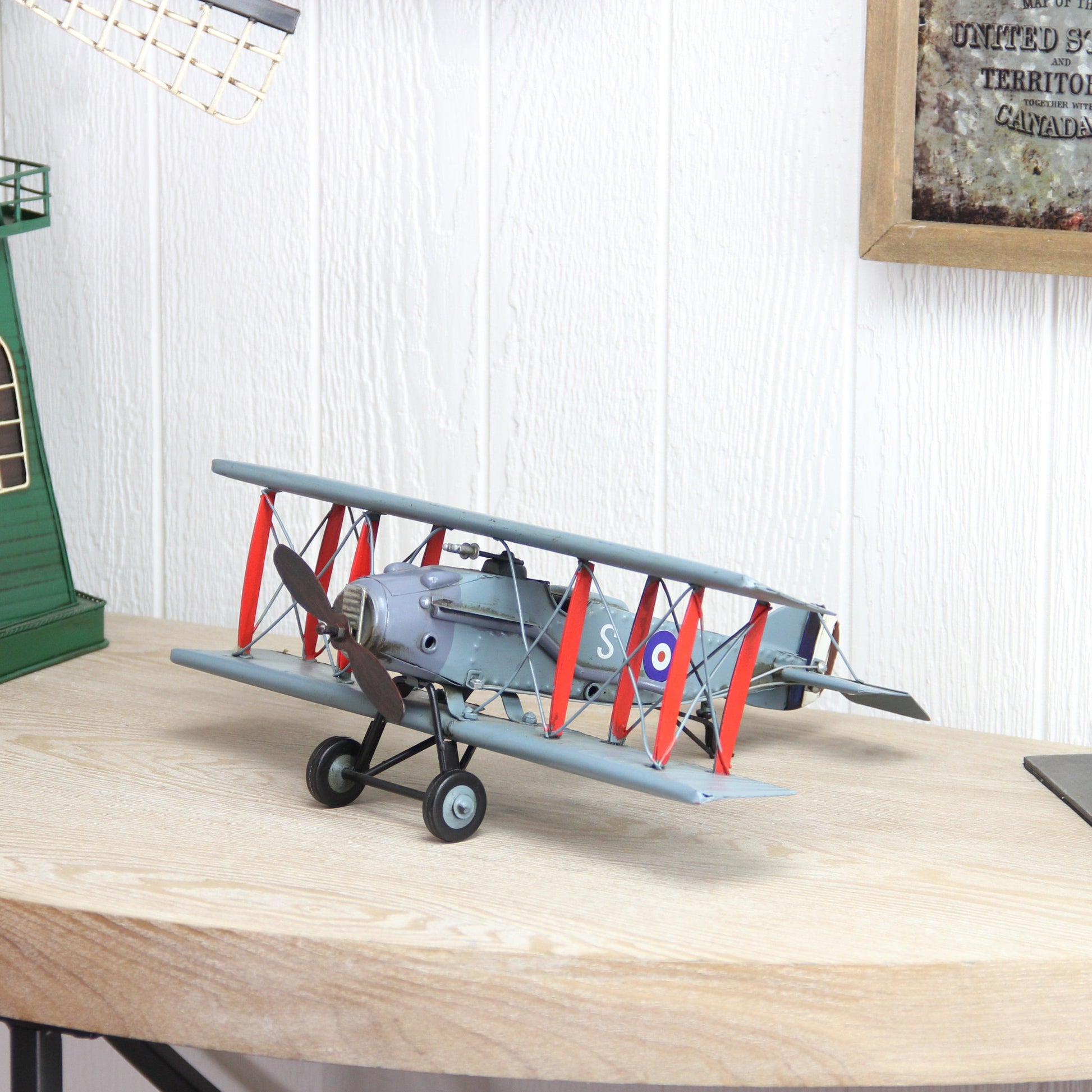 Unique and decorative, this 5-inch red and gray metal hand painted model airplane will leave a lasting impression. This red and gray hued piece represents high quality, expertly made from high grade metal. This replica makes a great tabletop accent for your coffee table, desk, bookshelf, dresser or mantle. A perfect decorative addition for anyone who loves nostalgia and vintage style models and replicas. It's a perfect addition for those who love an up-to-the-minute look and feel. 5-inch H x 14-inch W x 12-inch D
