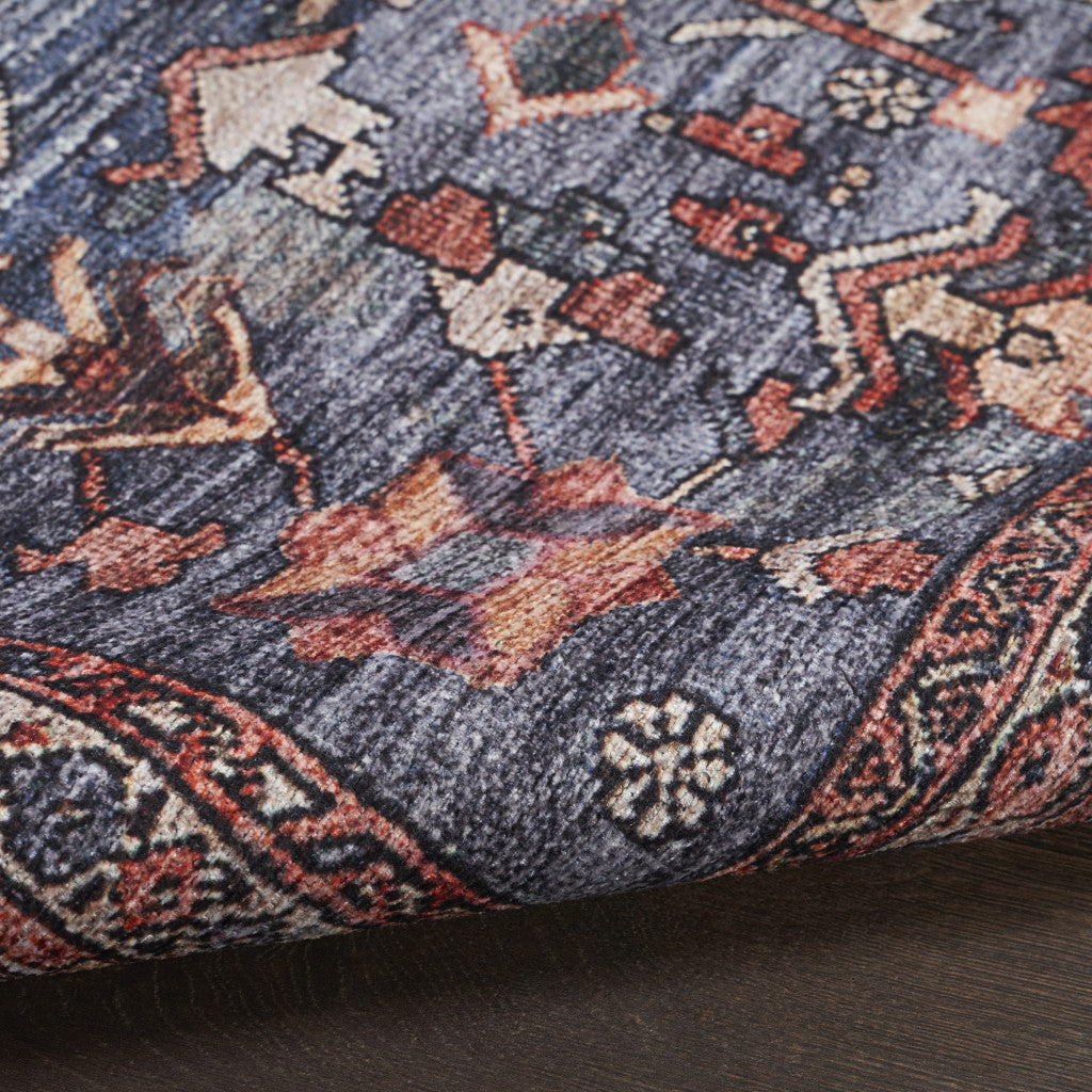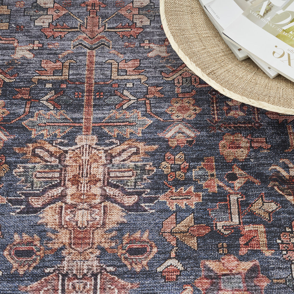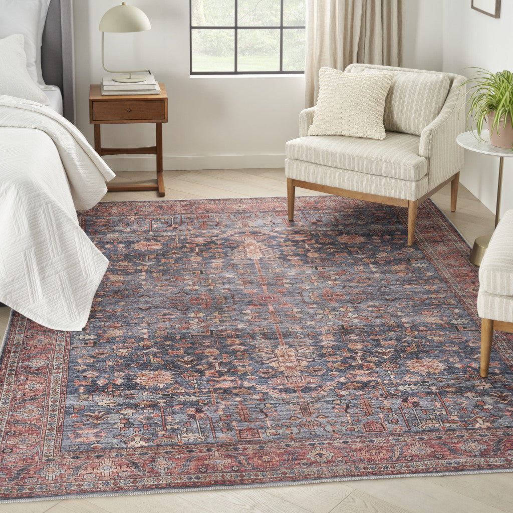 5' x 7' Blue and Red Oriental Power Loom Distressed Washable Non Skid Area Rug