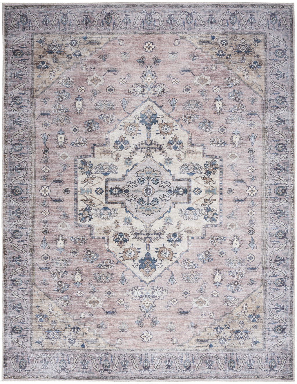 This 5-foot x 7-foot pink and blue oriental power loom distressed washable non skid area rug, is a great way to add warmth to a room. This rectangle shaped rug features a oriental design in pink and blue to give it visual interest. A classic shape marries with good looking design for your space Area Rugs help to give warmth and sense of home to your space. .25-inch H x 63.00-inch W x 87.00-inch D