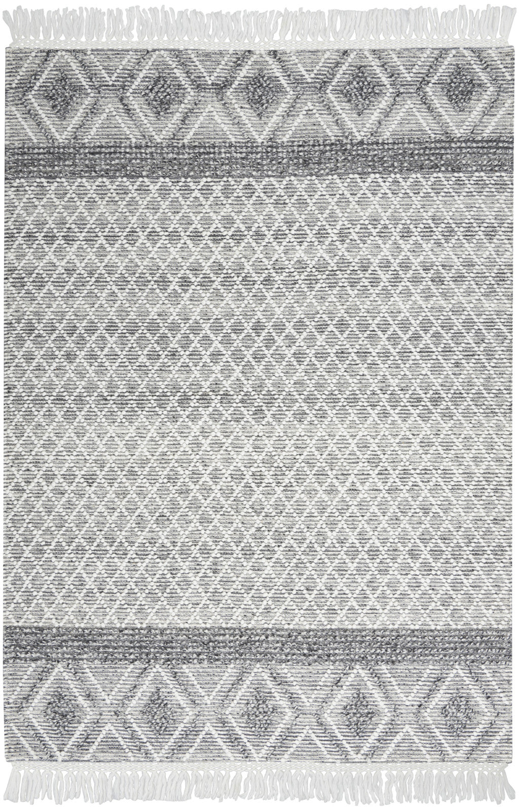 Add some artistry to your room with this 5-foot x 8-foot gray and ivory geometric hand woven area rug with fringe. This rectangle shaped rug features a geometric design in gray and ivory to give it visual interest. A classic shape marries with good looking design for your space Tassel ends bring a timeless and fashionable look to your interior. Crafted by skilled artisans, this hand woven rug is genuine and unique. No two will be exactly alike. Place this area rug against a hardwood or tile floor and it will enliven your living space with style and sophistication. .50-inch H x 63.00-inch W x 90.00-inch D
