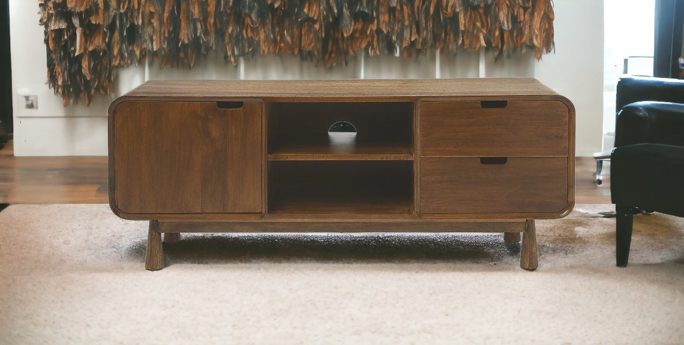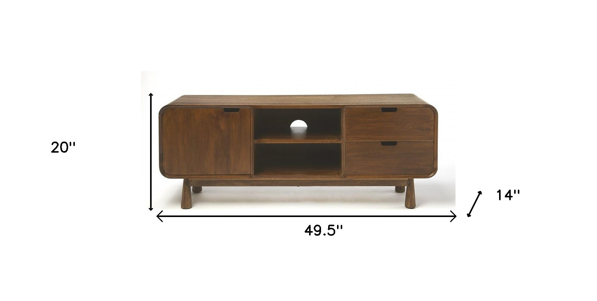Practical, space saving, and good looking, this 50" medium brown wood curved edge enclosed storage tv stand is a versatile media storage solution. To add to the versatility, this piece features open non-concealed storage that can be used for not only storage but display as well. A cord cut out hole is ideal for wire and cable management to keep your space looking tidy. Ideal for tv placement and storage in your living room, bedroom or office. 20" H x 49.5" W x 14" D