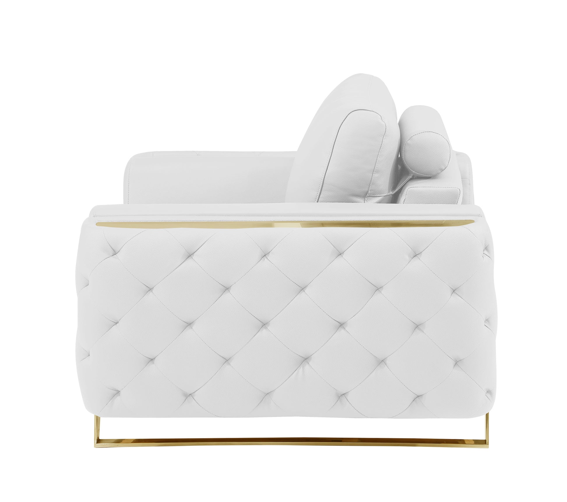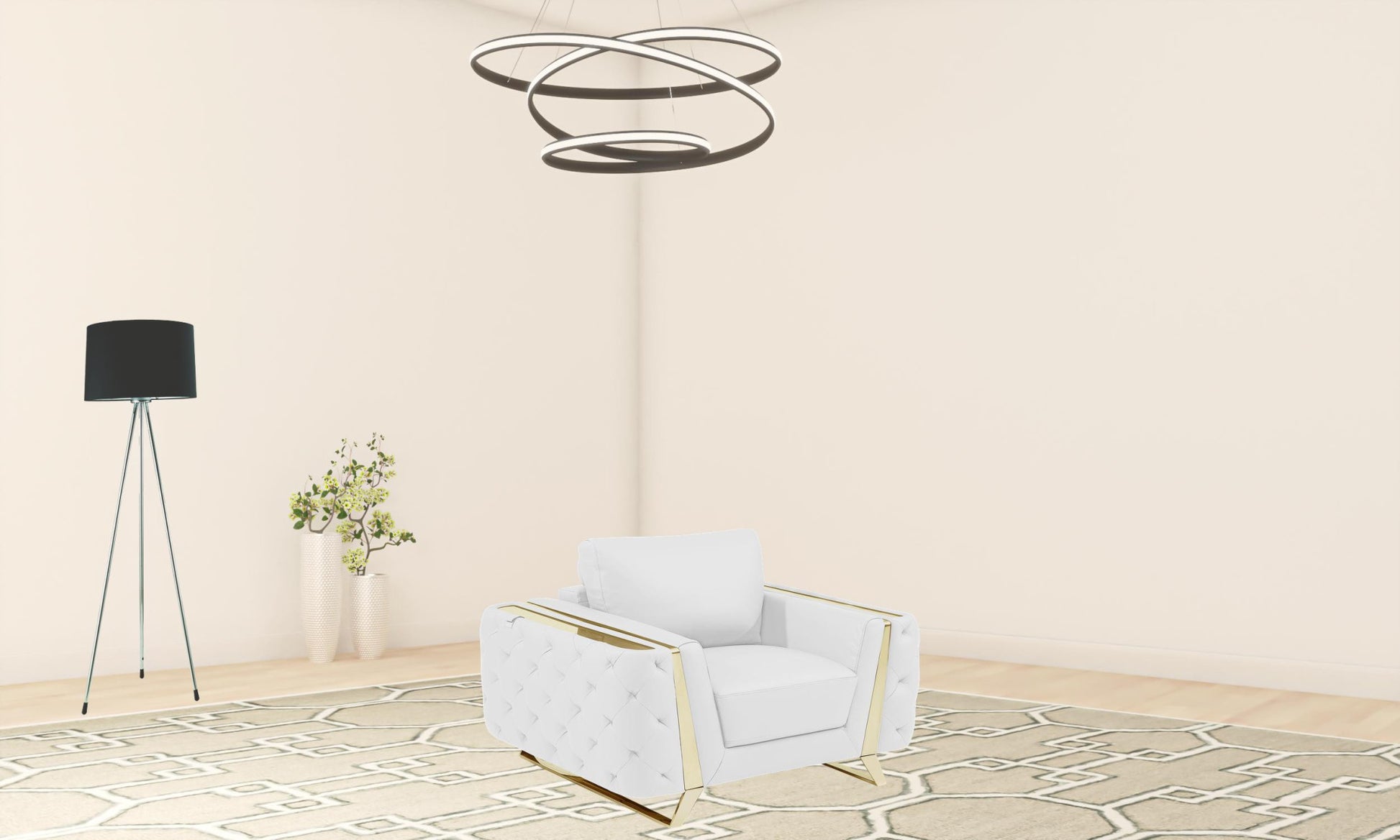Introduce a touch of elegance and sophistication to any room with our stunning 50-inch white and gold genuine leather arm chair. This accent chair combines comfort and style with its cushion back design and pocket spring seat construction. Crafted from solid wood and featuring metal legs in a sleek gold finish, this chair is both durable and visually pleasing. The genuine leather upholstery adds a luxurious feel to your space, while the solid white color brings a sense of modernity. Perfect for any setting, whether it's your living room, bedroom, or office, this accent chair is sure to impress. 34-inch H x 49.5-inch W x 39-inch D