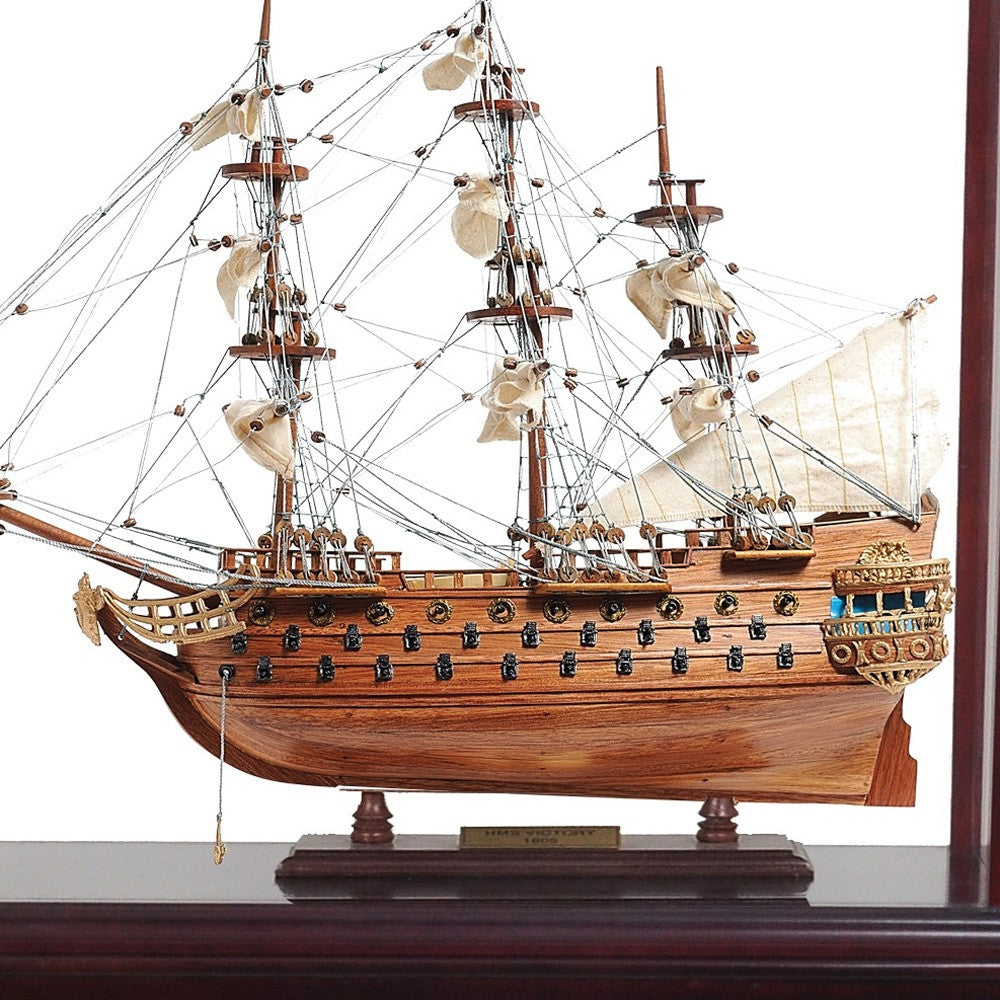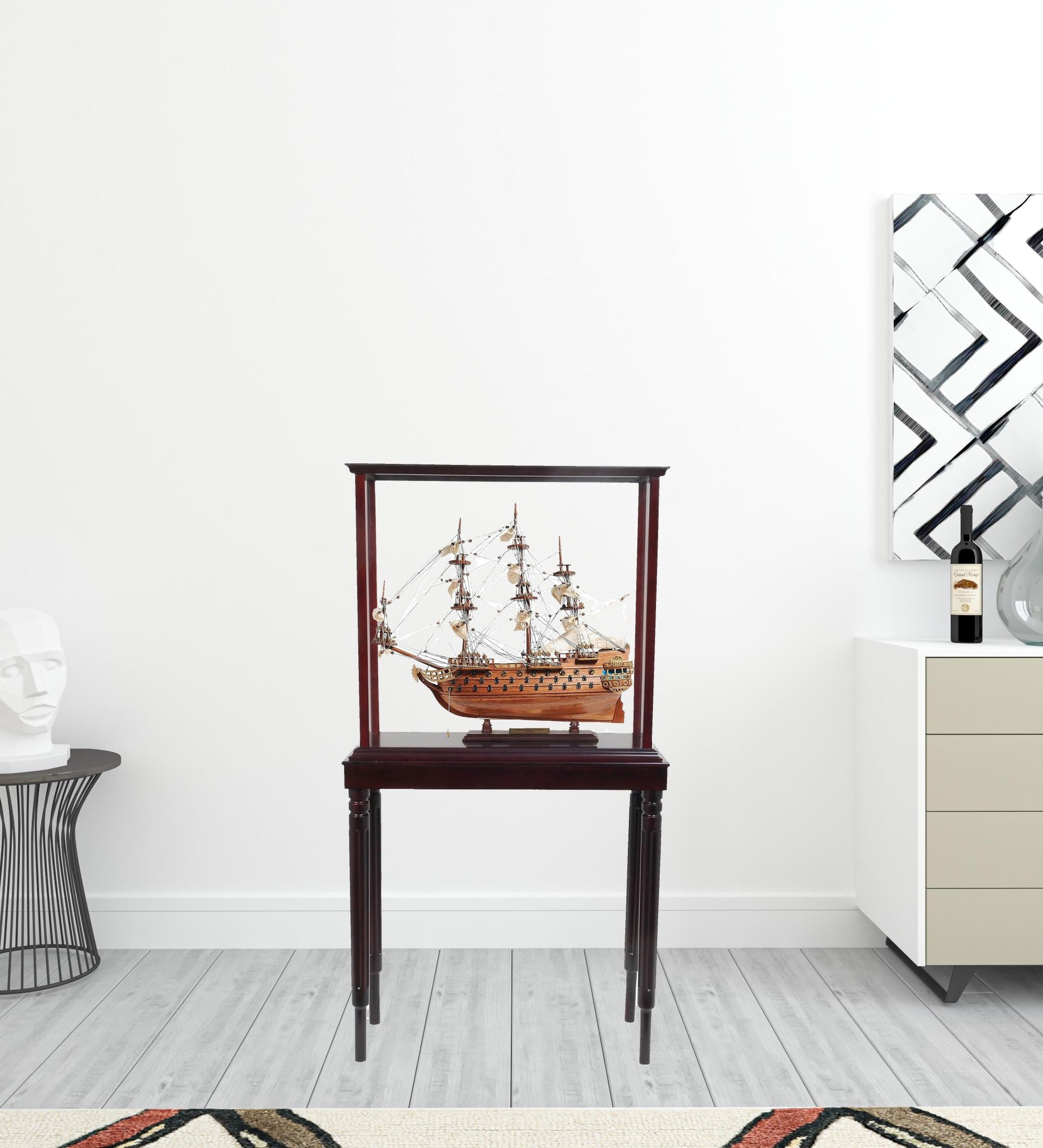 Eye-catching and incredibly detailed, the San Felipe 1690 Small Display Case Model Ship is a unique hand-built model of the 96 gun Spanish Armada flagship unveiled in 1690. Handmade by the most talented craftsman using high-quality wood like western red cedar, rosewood, and mahogany. Each model requires hundreds of hours of painstaking plank-on-frame construction and detailing. It includes incredible details as three decks, three rows of cannons on each side, hand-stitched linen sails, and other meticulous detailing. It comes with a solid wood base and brass nameplate. It is a true gem for any collector or maritime enthusiast 49.75" H x 26.5" W x 11" D