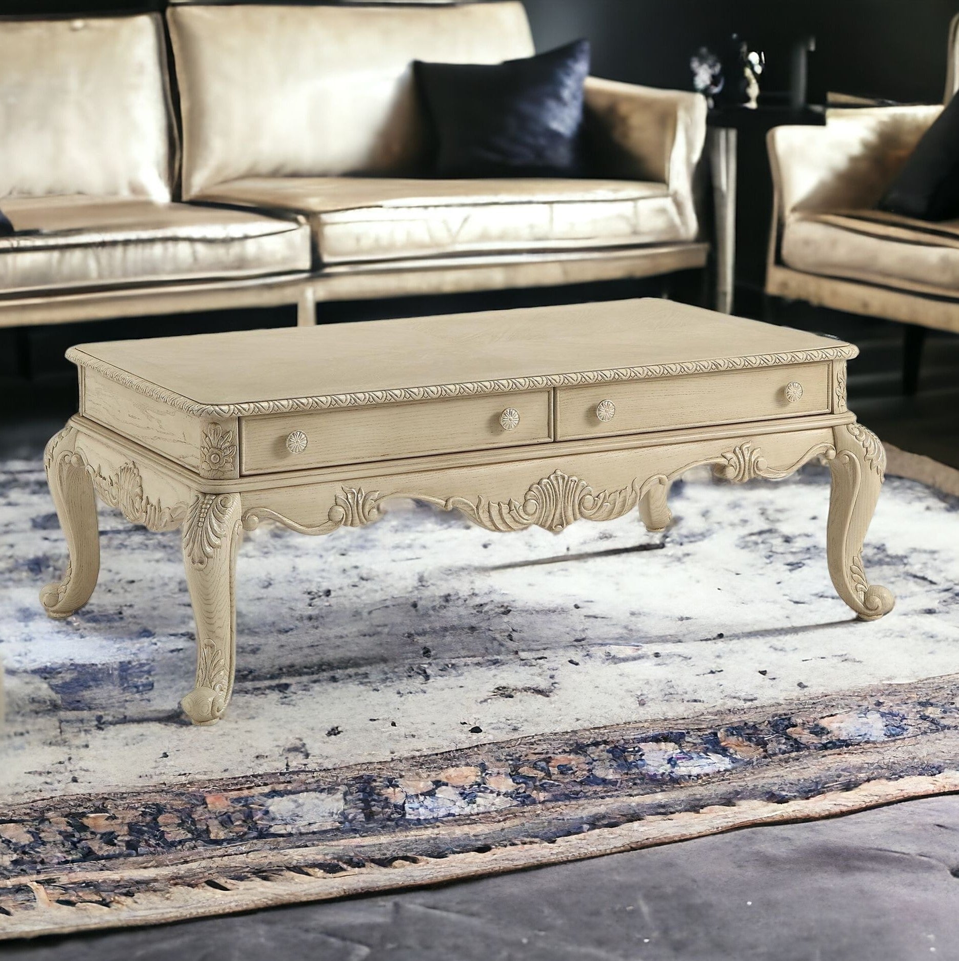 This good looking 52-inch antique white solid and manufactured wood coffee table with two drawers is sure to inspire compliments no matter where it sits. This table features quality construction from solid and manufactured wood and an updated monotone color scheme with antique white as the main color on both the top and the base. This classic rectangular table will be a great accent in any room queen anne legs are a sign of high quality and classic construction. If you're looking for something that can fit into a living area, bedroom, or office, this coffee table is for you. This coffee table is the sturdy, reliable and stylish answer to your living room needs. 19-inch H x 52-inch W x 30-inch D