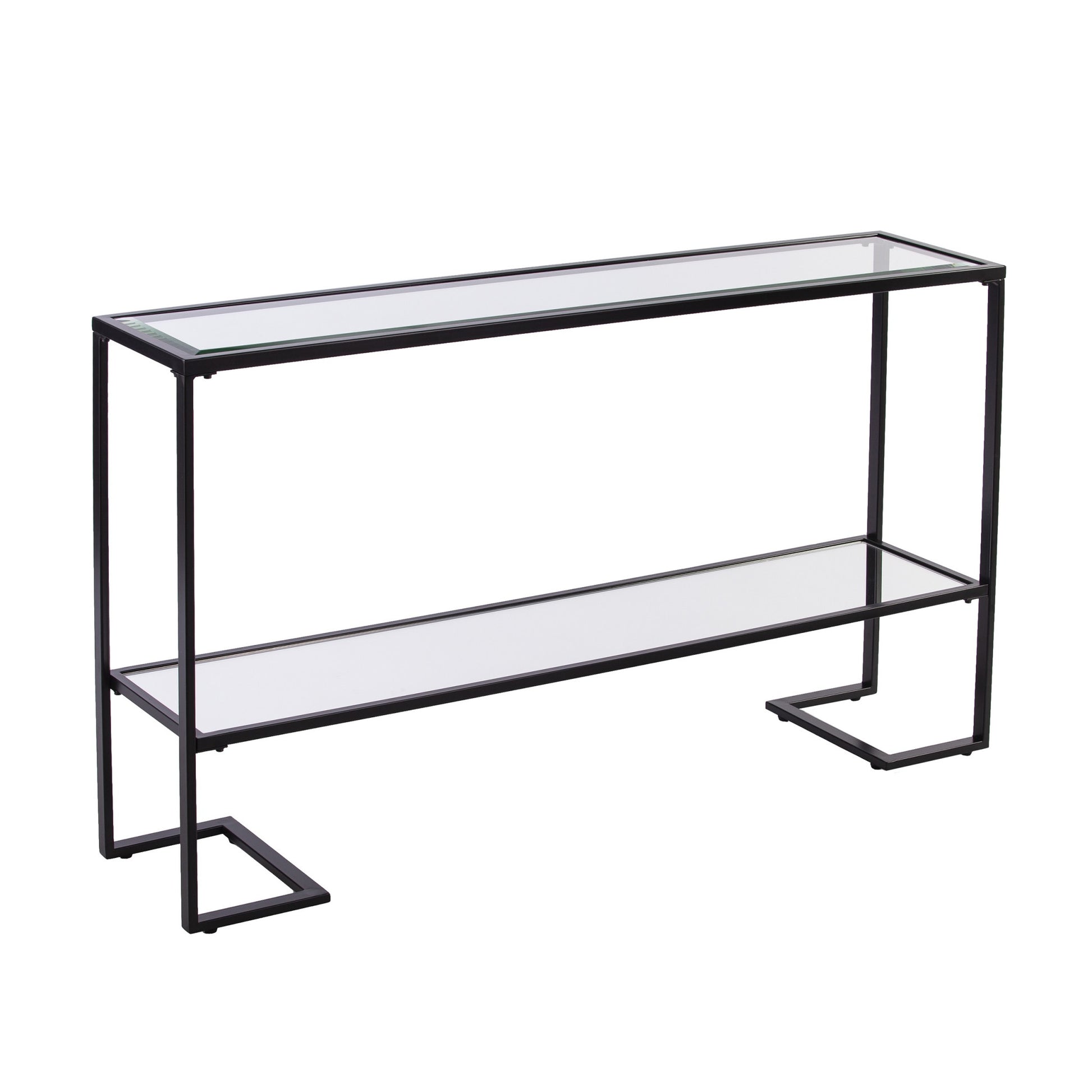This 52-inch clear and black glass mirrored frame console table with storage is a high-quality, long-lasting piece of furniture that you can enjoy for years to come. This rectangular table has clean lines and plenty of surface area. The clear glass top of this console table is a stunning and timeless choice that can transform any room into a visually captivating showcase. Versatile in use, console tables can be used for a variety of purposes in a variety of rooms and settings. 29-inch H x 52-inch W x 12-inch D