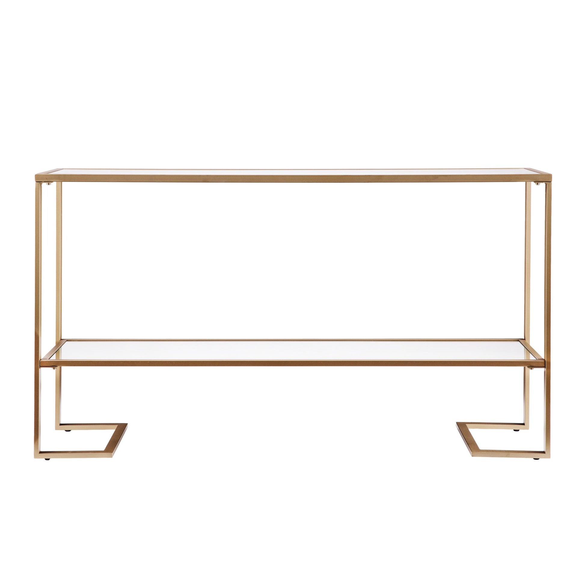 Transform your home with our elegant and versatile 52-inch clear and gold glass mirrored frame console table with storage. Don't miss out on the perfect finishing touch for your home. This versatile table is a classic rectangular shape, which will easily fit into most any space in your home. The clear glass top of this console table will immediately stand out and grab your guests' attention. Ideal for living rooms, bedrooms, home offices, and lounge areas, this console table is not only good looking but multi-functional and practical addition to your space. 29-inch H x 52-inch W x 12-inch D