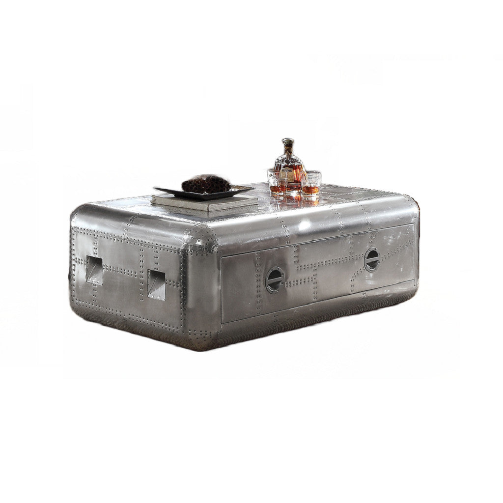Give your living room, family room, or office the perfect anchor piece with this 52-inch silver aluminum coffee table with drawer. This table features quality construction from aluminum and an updated monotone color scheme with silver as the main color on both the top and the base. This rectangular table is a unique and updated way to accent your room. Bring some fresh design with a nod to aviation and aircraft industrial styling. 19-inch H x 52-inch W x 31-inch D
