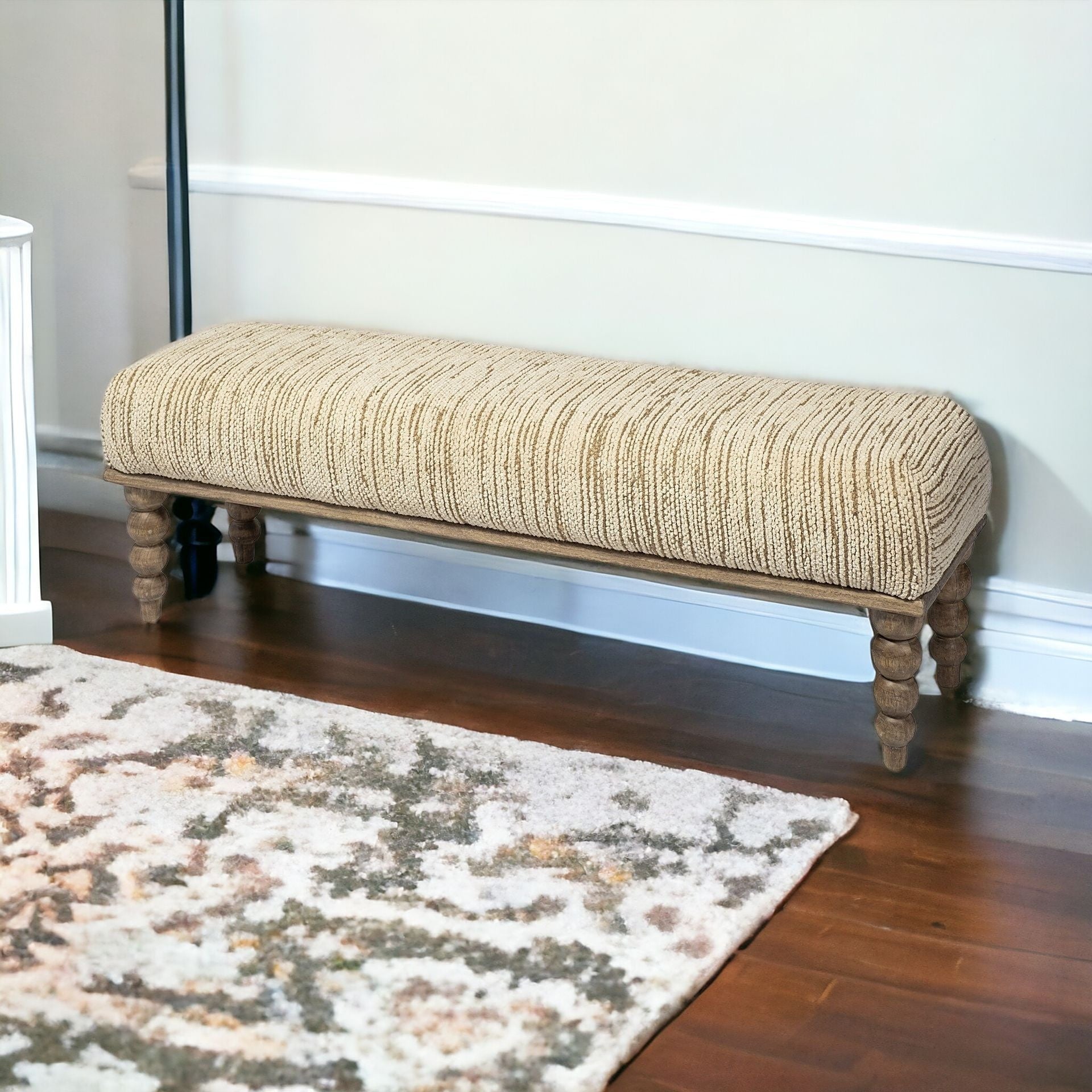 Add a good looking decorative accent to your space that is also practical for seating. A wood brown solid wood frame is finished off with a cream upholstery seat that is the epitomy of quality construction and design. Expertly upholstered with padding and soft polyester blend in a no pattern and not solid color pattern, this bench is as comfortable as it is good looking. Ideal for entrance foyer, hallway, or laundry room. This bench is a great place store your keys, put on your shoes, or be a catchall on your way in or out. Easy to blend into most any room, a bench is a way to add a good looking accent to your space that can also be practical and useful. . 18-inch H x 55-inch W x 16-inch D