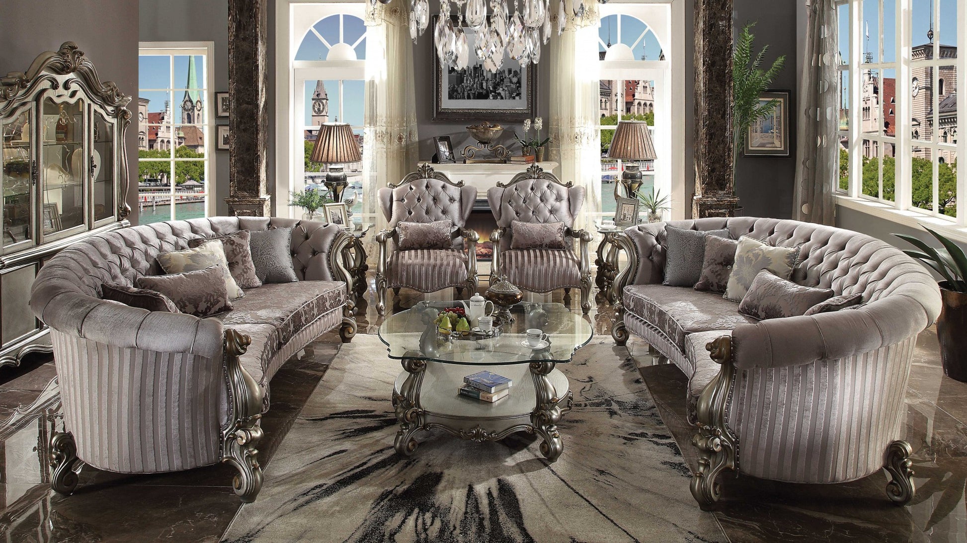 Sleek and urban. This modern sofa will make the perfect addition for the living room area or bedroom in any contemporary home. It is expertly upholstered with plush cushion fabric, highlighting deep button tufted and nail head trim details. It stands on a delectable base embellished and scrolled feet for stability and balance. Every feature of this chair is working together to keep you at ease and very cozy. This chair is given a striking modern appeal with the velver PU and antique platinum finish. This seat comes along with 5 pillows for extra cushioning effects. It comes in the dimension of 55 by 109 by 39 inches.