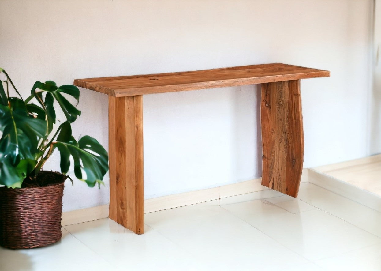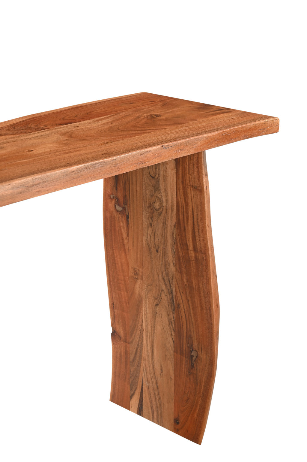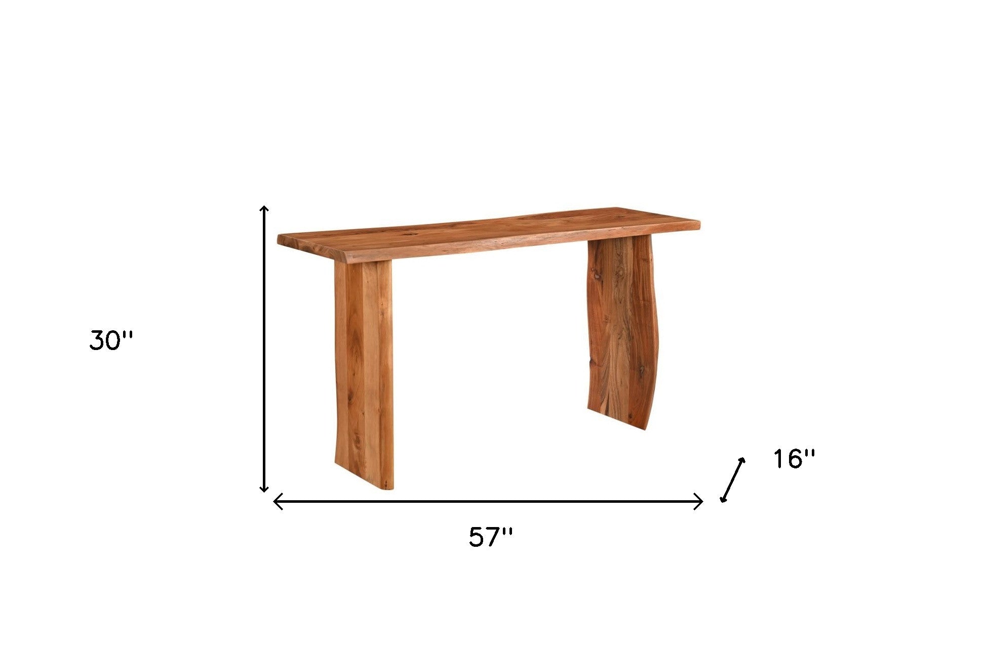 Transform your home with our elegant and versatile 57-inch chestnut solid wood sled console table. Don't miss out on the perfect finishing touch for your home. This rectangular table has clean lines and plenty of surface area. This unit has a chestnut genuuine hardwood tabletop. The sled of this unit is crafted with solid wood, leaving you with a console table that is of the finest quality and materials. Ideal for living rooms, bedrooms, home offices, and lounge areas, this console table is not only good looking but multi-functional and practical addition to your space. 30-inch H x 57-inch W x 16-inch D