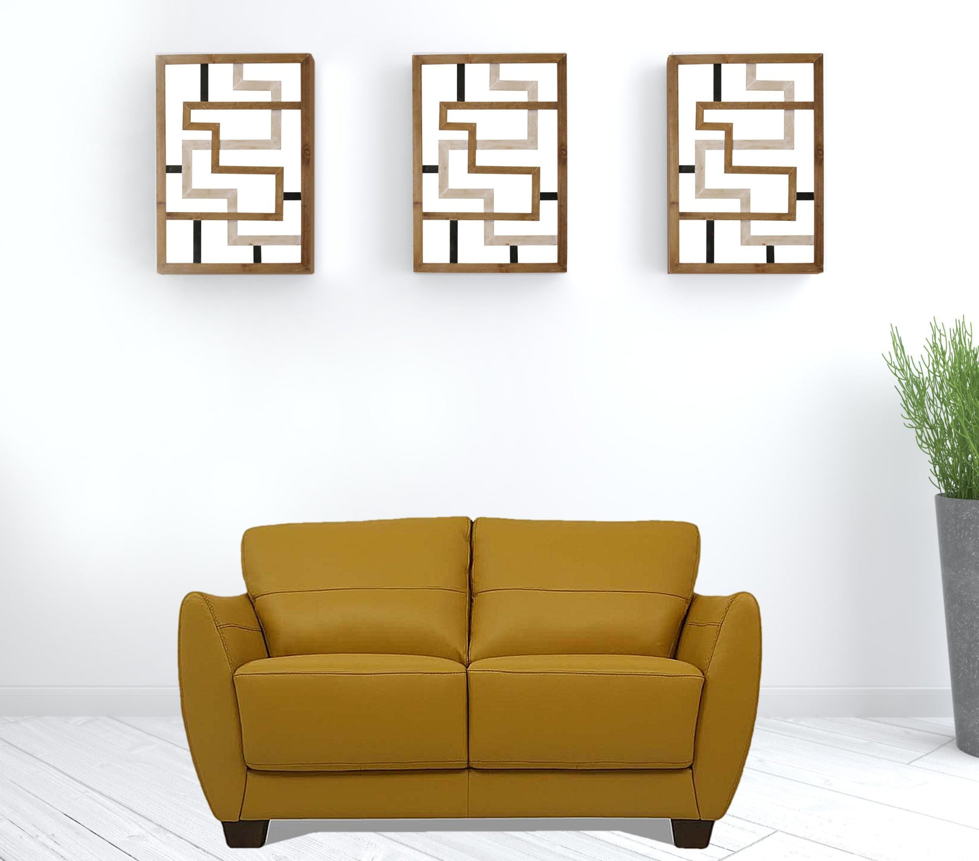 Superior construction from fabulously soft and high grade leather gives this 57" mustard leather and black standard love seat a leg up on the competition. The high grade premium leather used makes your lounging luxuriously comfortable and adds an elegant appeal to your space. Flared arms offer a comfy place to rest and give this piece some interest and shape. A great showpiece for your room, this sofa is a must have. 31" H x 57" W x 36" D