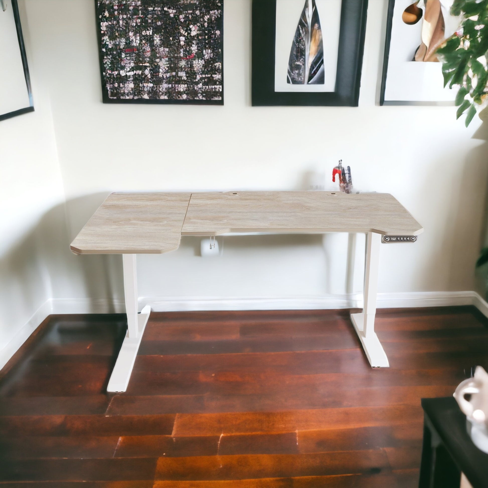 Protect your posture and overall wellbeing with this fabulous 59" adjustable light khaki and white l shape standing desk. Built to last, this sturdy desk is designed for comfort and efficiency for years to come. 46" H x 59" W x 24" D