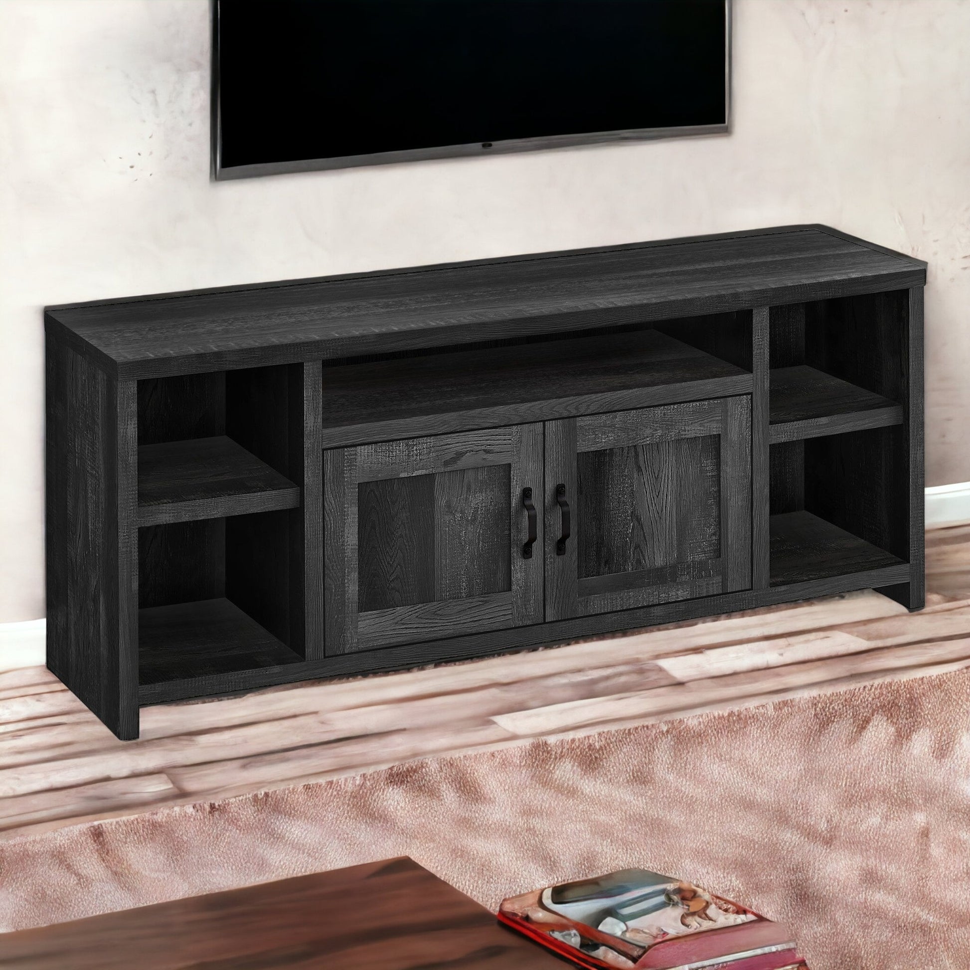 Experience entertainment right in the comfort of your own home with the 59-inch black cabinet enclosed storage tv stand. To add to the versatility, this piece features open non-concealed storage that can be used for not only storage but display as well. Ideal for tv placement and storage in your living room, bedroom or office. 23.75-inch H x 59-inch W x 15.5-inch D