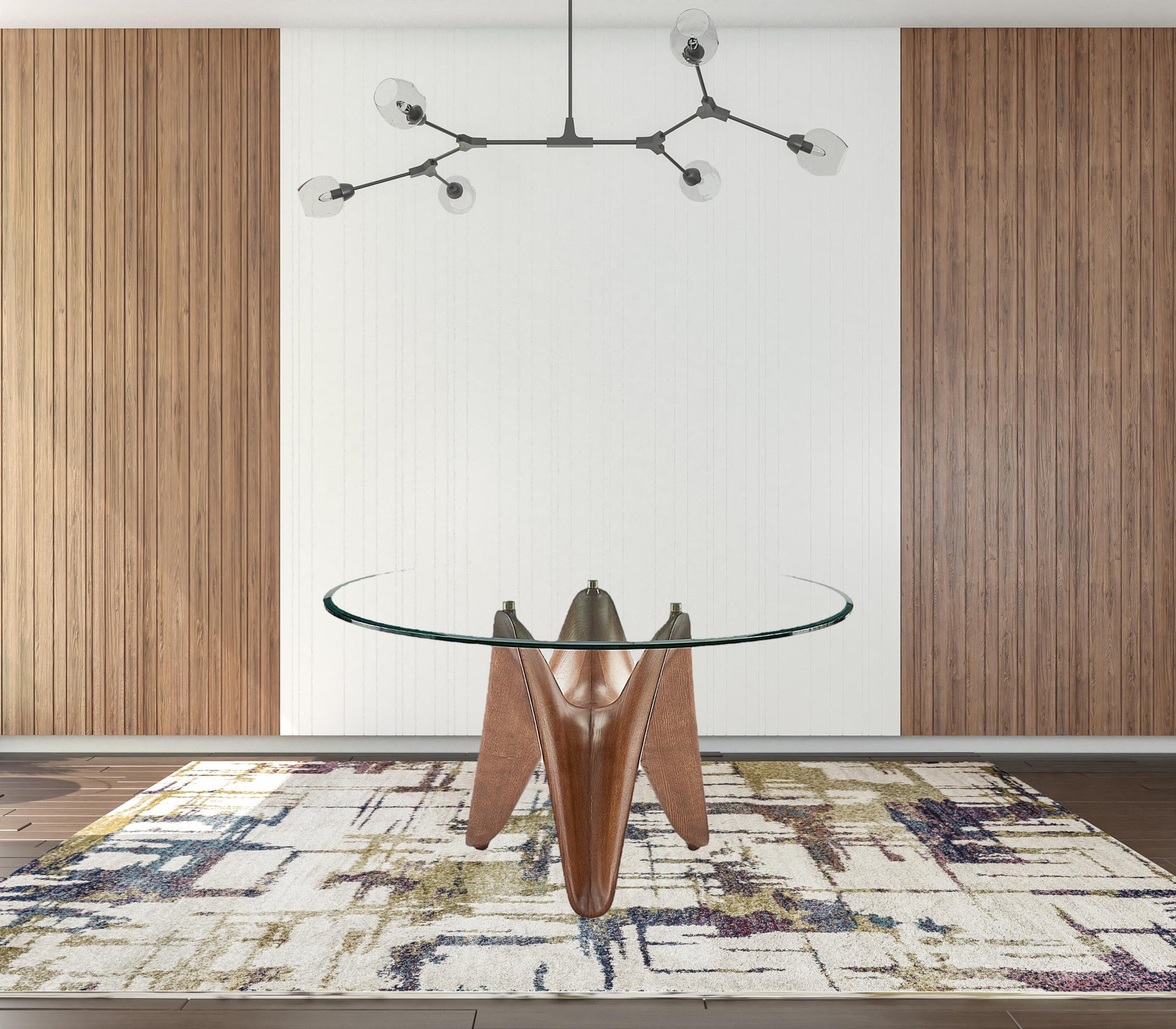 Make a statement with the 59" clear and walnut rounded glass and solid manufactured wood dining table and infuse a dash of character and personality into your space. The walnut coloration of the high quality solid + manufactured wood base marries nicely with the clear glass top surface. The two-tone finish gives it a fresh and updated look. Glass top dining tables have a modern and contemporary flair but are super practical and easy to wipe clean. This table features a pedestal base that adds some depth and interest to your space. This dining table seats 6 people comfortably. This table is the sturdy, reliable and stylish answer to your dining room needs. This eye-catching dining table is ready for you to enjoy breakfast for one or entertain your guests. 29.5" H x 59" W x 59" D