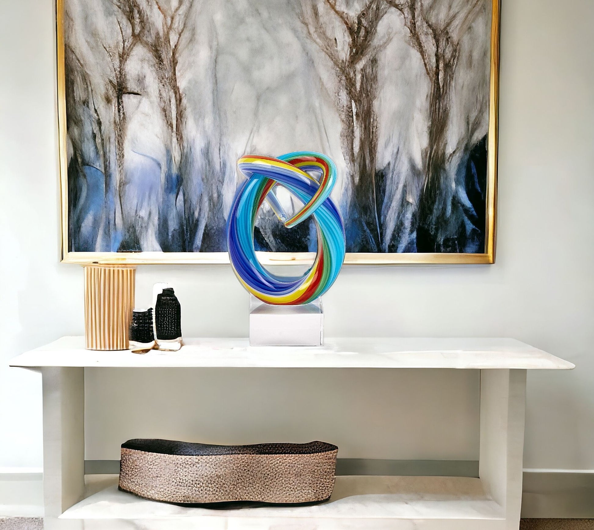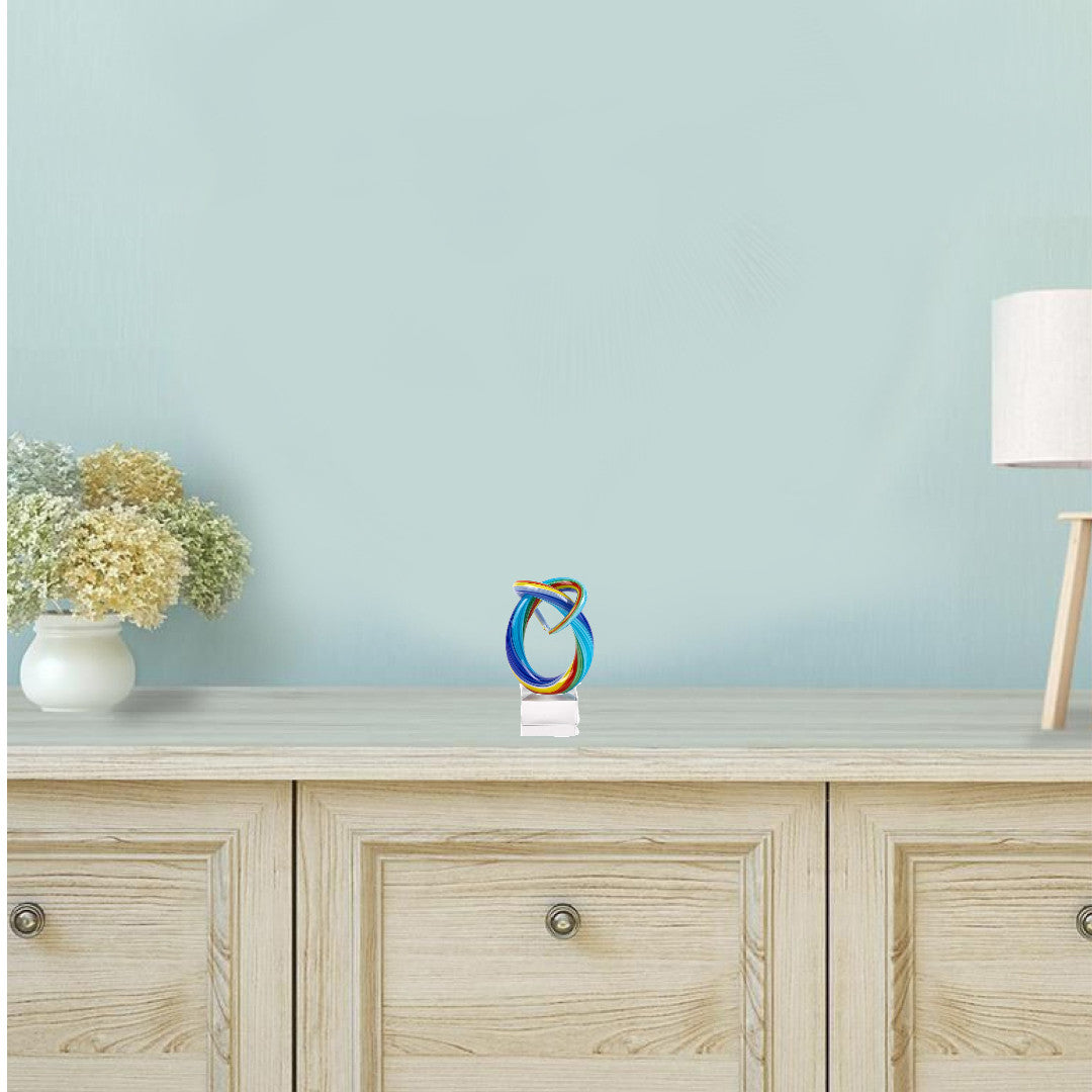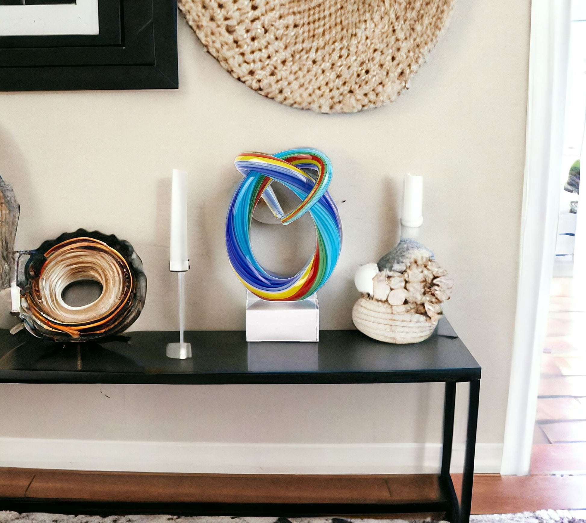 Bring some sizzle to your space with this eye-catching 6-inch clear and rainbow abstract art glass sculpture. A clear crystal base hosts this vibrant circular abstract design. Infused with shades of blue, yellow, red, and green, this beautifully colored piece is made from high grade Murano style glass. This sculpture makes a great tabletop accent for your coffee table, counter, bookshelf, mantle, or even dining table. 6-inch H x 4-inch W x 2.25-inch D