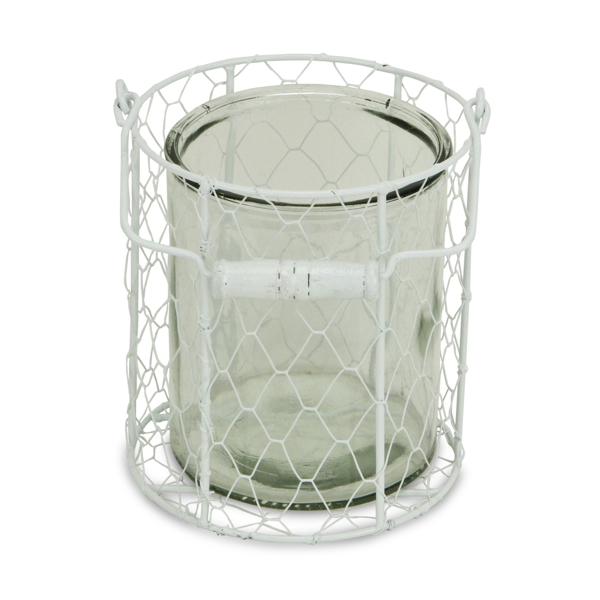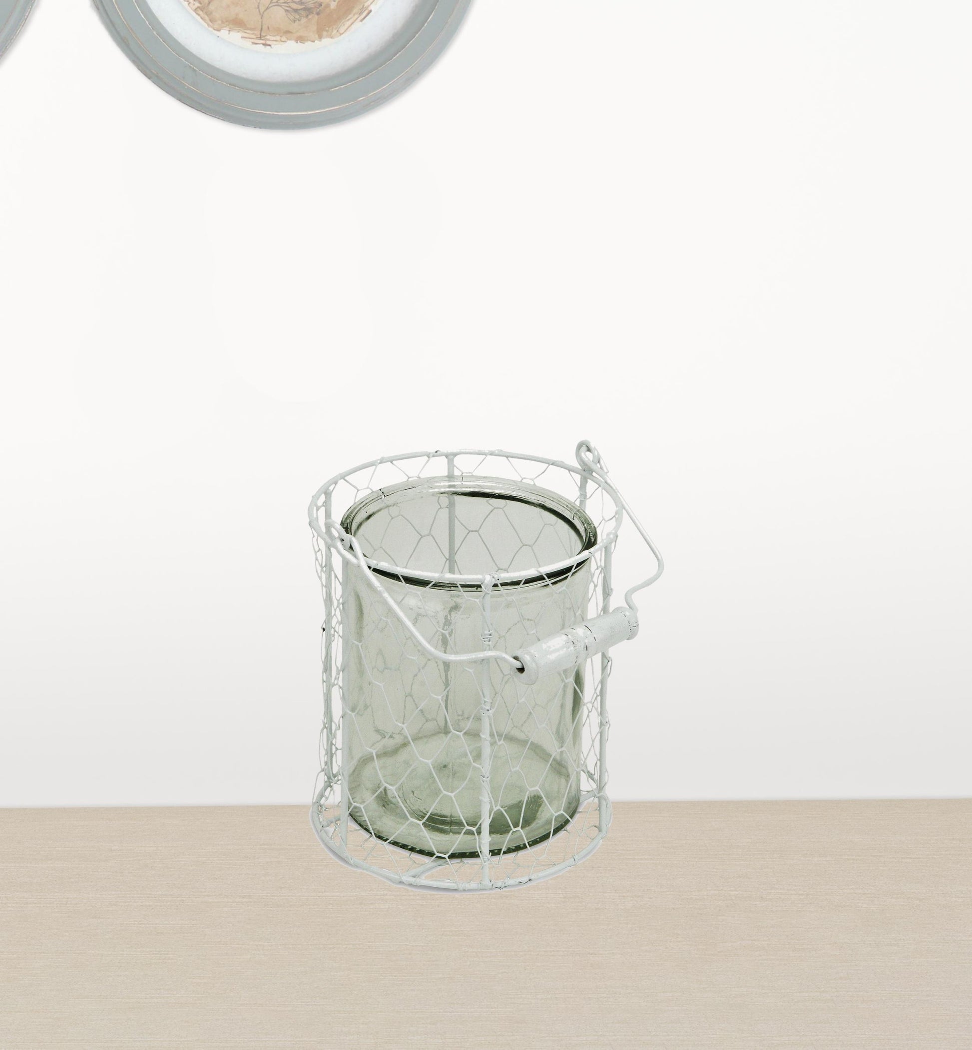 Unique and decorative, this 6" white and clear wire basket and glass jar will leave a lasting impression. This brown colored piece is made from high grade wire and clear glass. Great to use on its own or mix with other decorations for the perfect look. Can be used as a stand alone decorative accessory but also can hold fillers, hold utensils, hold pens, hairbrushes etc. Use this piece as bookshelf decor, on your desk, coffee table, or anywhere in your home. 6.5" H x 6" W x 6" D