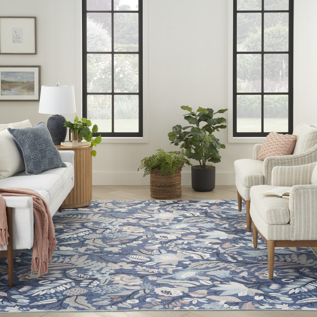 This 6-foot x 9-foot blue and off white floral power loom washable non skid area rug, is a great way to add warmth to a room. This rectangle shaped rug features a floral design in blue and off white to give it visual interest. A classic shape marries with good looking design for your space Place this area rug against a hardwood or tile floor and it will enliven your living space with style and sophistication. .25-inch H x 72.00-inch W x 108.00-inch D