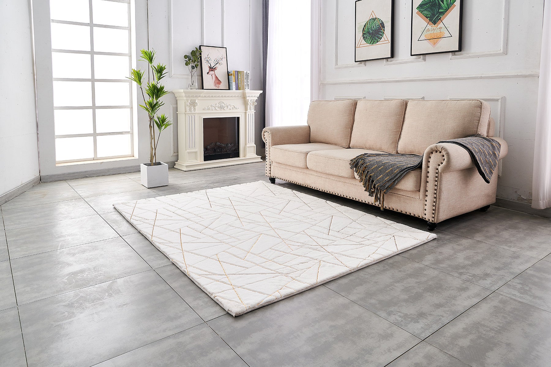 This 6-foot x 9-foot white and gold faux sheepskin abstract geometric machine tufted washable non skid area rug, is a great way to add warmth to a room. This rectangle shaped rug features a abstract geometric design in white and gold to give it visual interest. A classic shape marries with good looking design for your space area rugs help to give warmth and sense of home to your space. 72-inch H x 108-inch W x 1-inch D