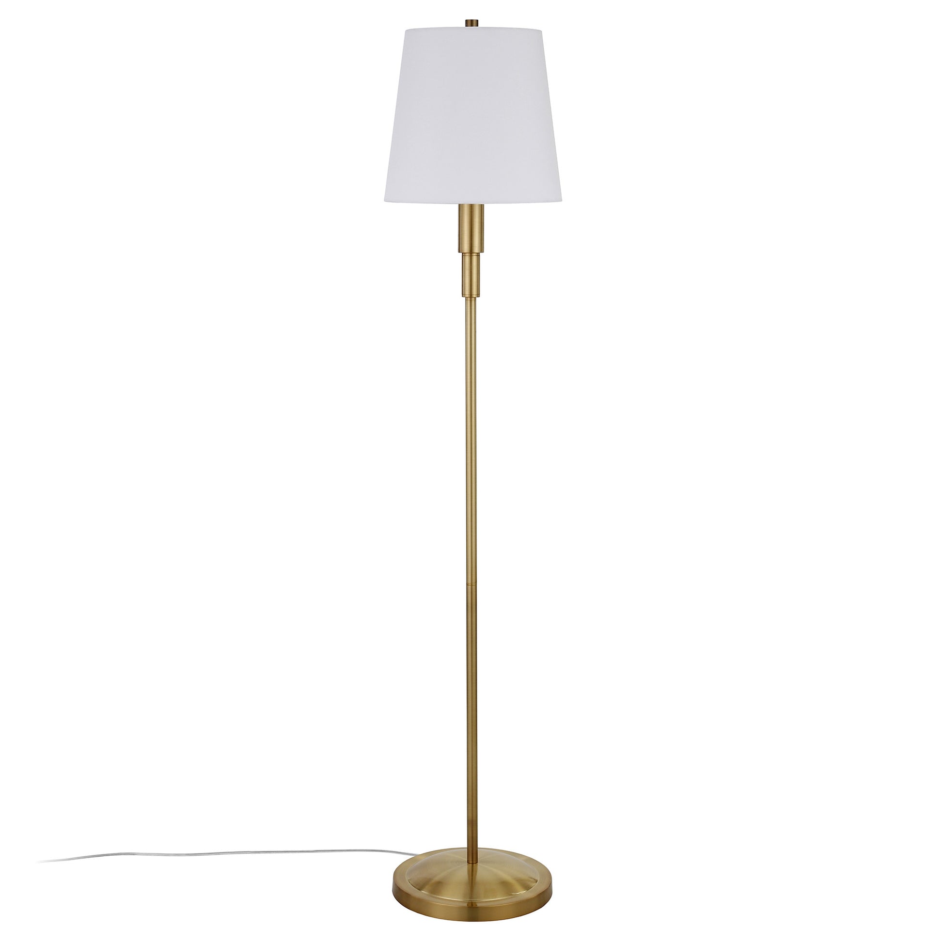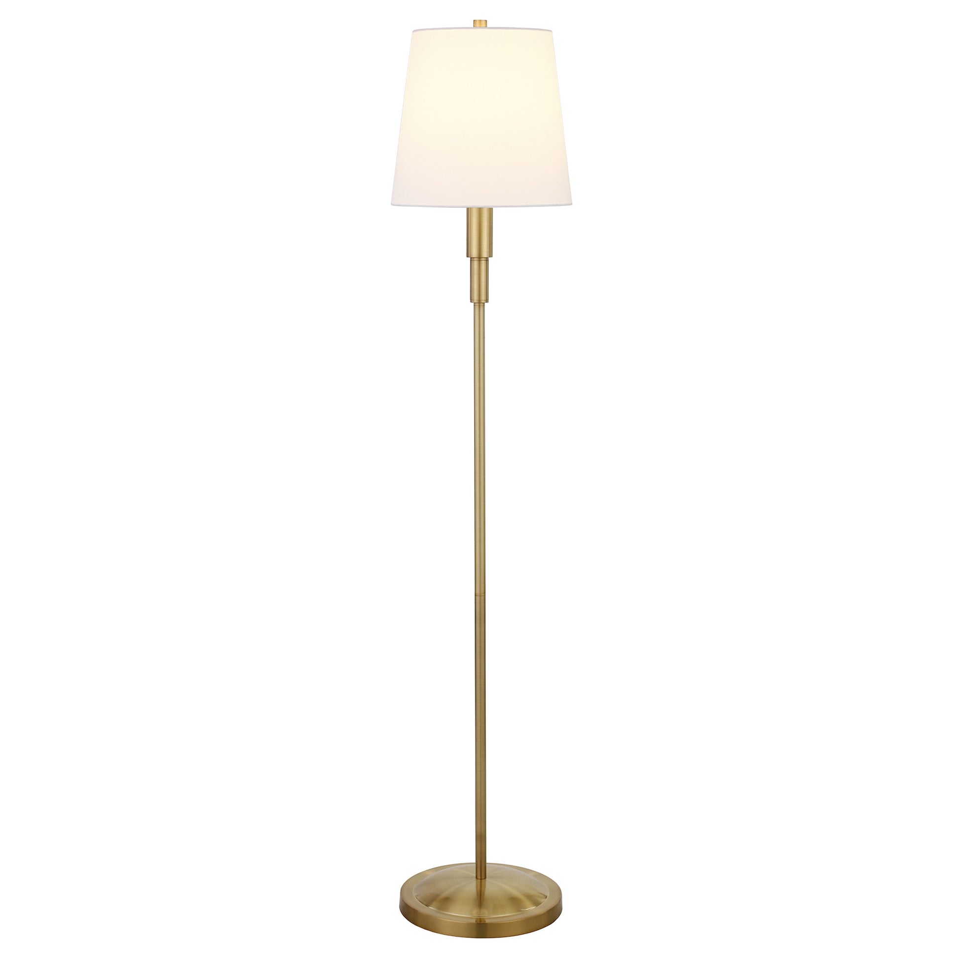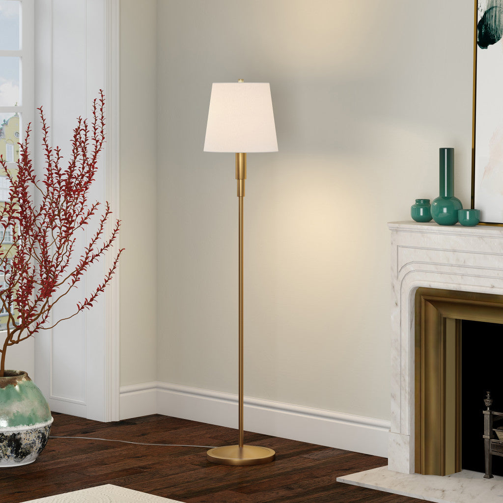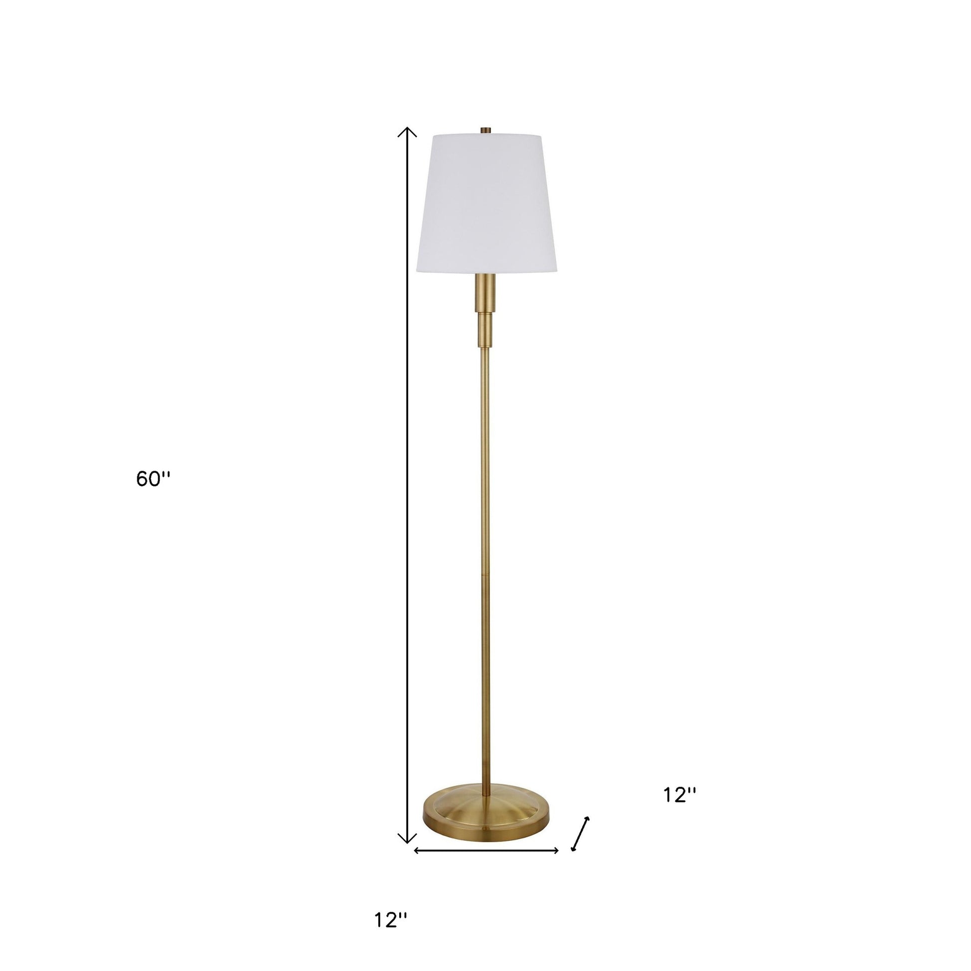 Bring of level of elegance and charm to your space with this good looking 60" brass traditional shaped floor lamp with white frosted glass drum shade. The base of this lamp is made of metal finished in a brass tone. The brass base coloring infuses a warm and rich tone to your space. The lamp shade has a drum shape and is made from fabric. Classically styled, this traditional lamp features a straight pole that extends upwards from a single base. High quality design makes this a great lamp for not only lighting, but accenting a room with style. Bring some lite and good vibes into your space with this updated and stylishly designed lamp. 60" H x 12" W x 12" D