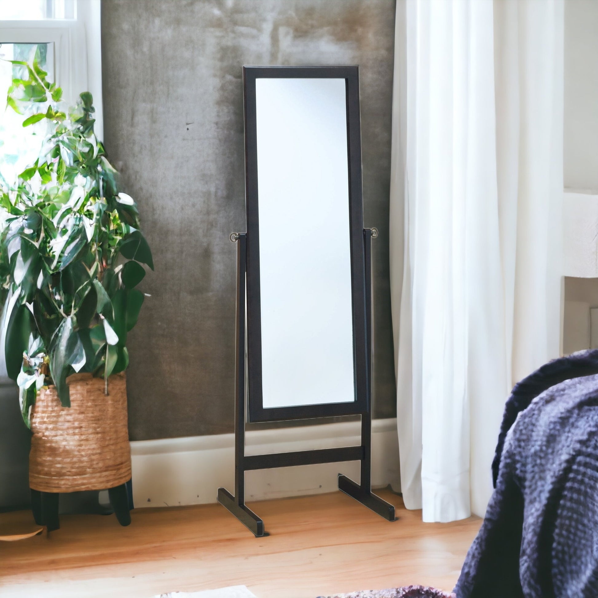 Attached to a base for support, this 60-inch brown framed cheval standing mirror offers a full length view that can be angled to tilt as needed. This freestanding mirror boasts a vertical orientation, adding a touch of elegance to any room. Crafted from engineered wood, the matte-finished frame enhances its durability. The rectangular shape provides a classic look, while the flat surface shape ensures a clear reflection. This mirror arrives as a single piece, ready to elevate your space with its stylish brown color palette. 60-inch H x 17.5-inch W x 21.25-inch D