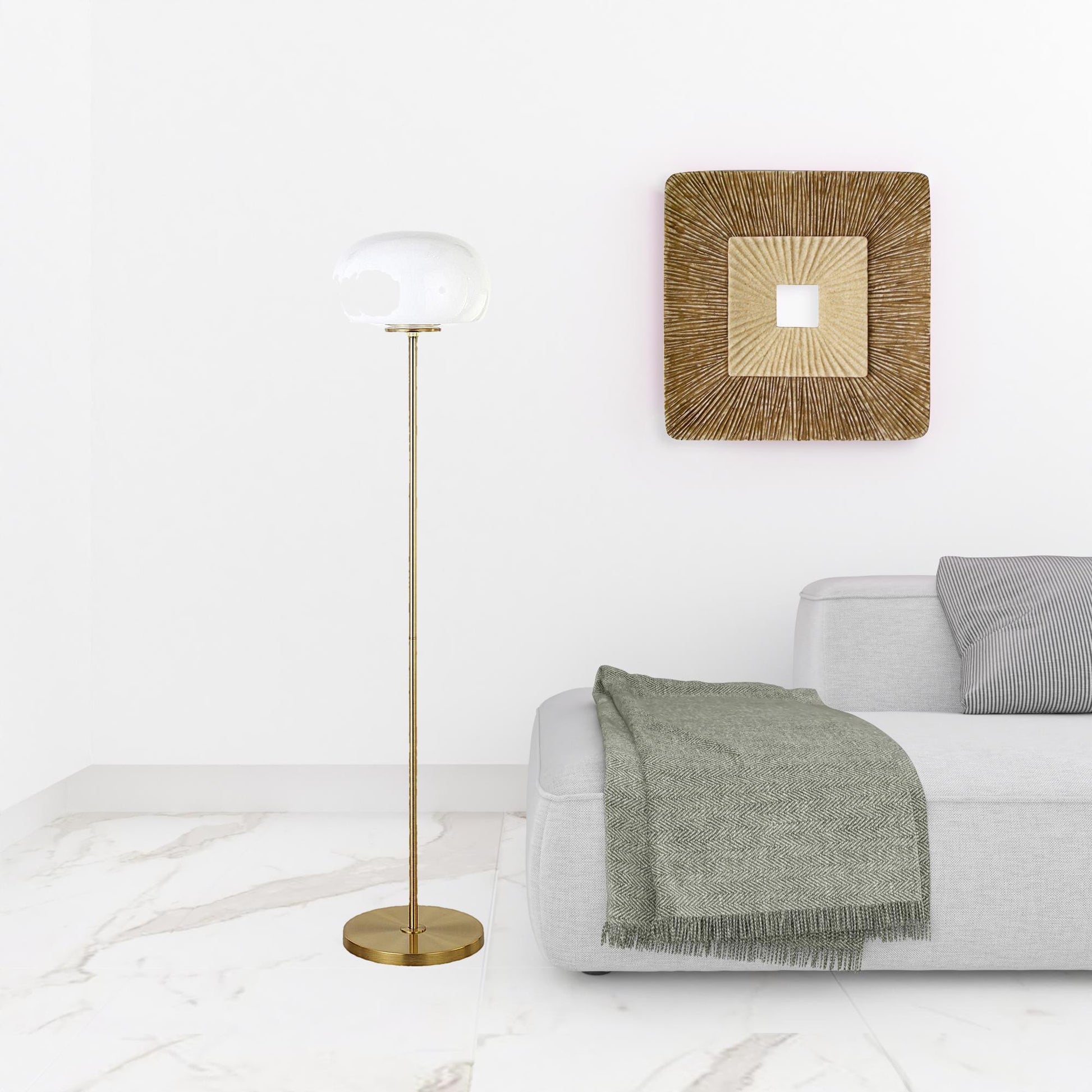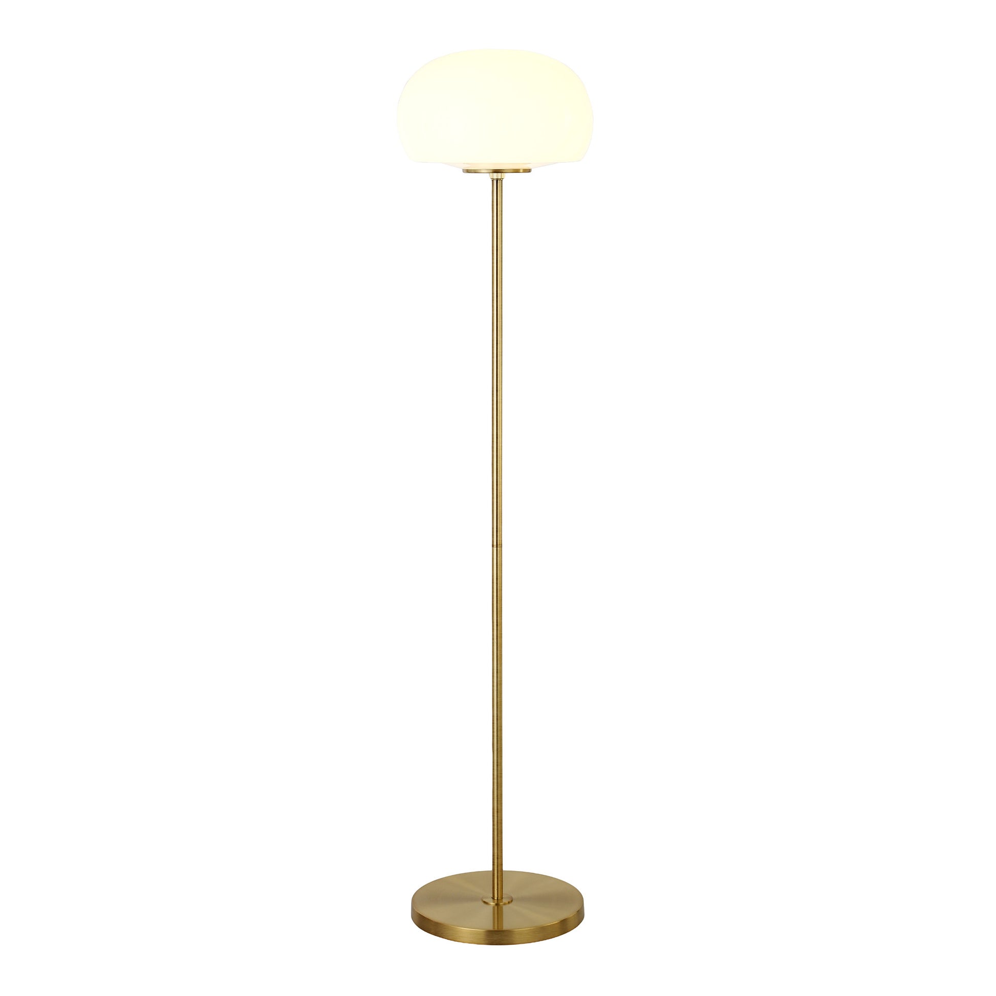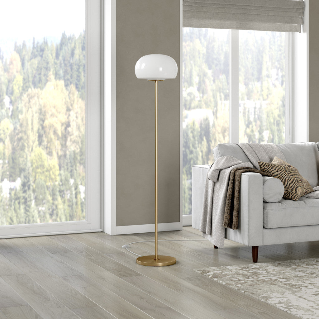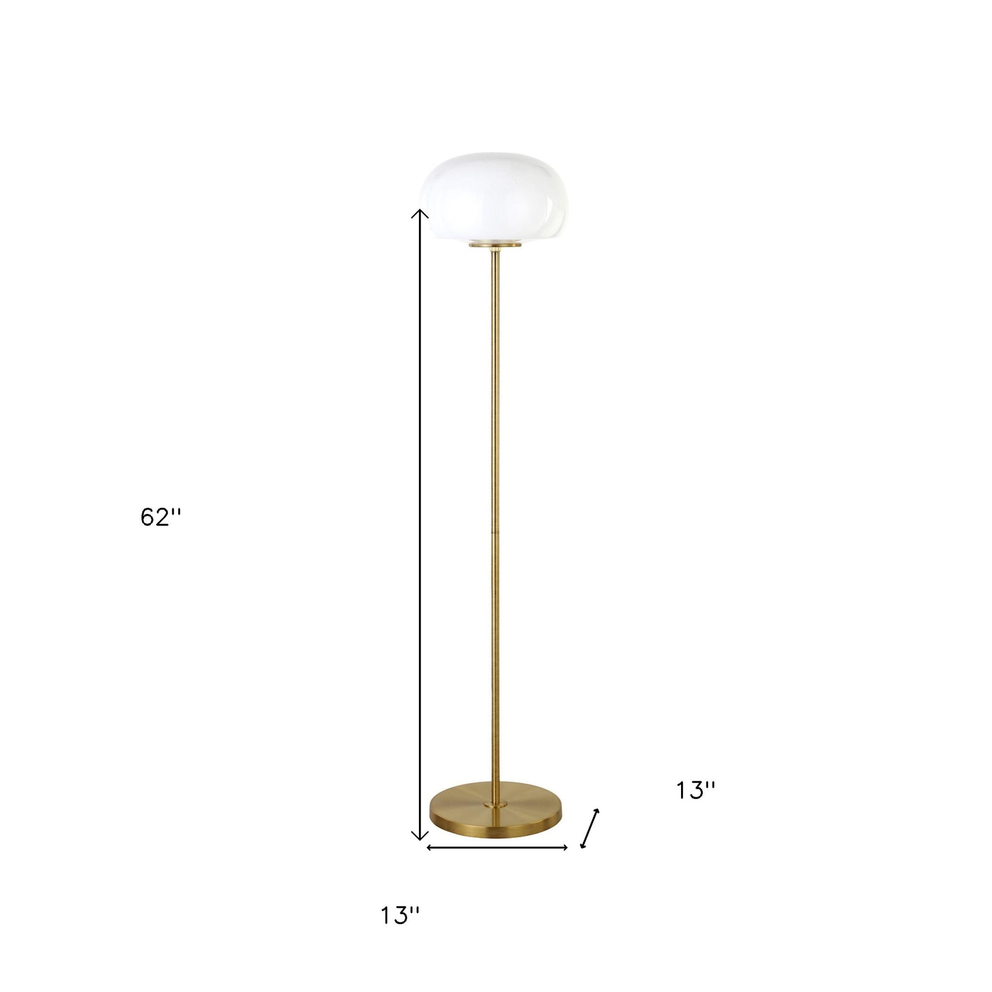 Bring of level of elegance and charm to your space with this good looking 62" brass novelty floor lamp with white frosted glass globe shade. A gorgeous brass metal base bring just the right amount of pizzazz to this fabulous lamp. The brass base coloring infuses a warm and rich tone to your space. This good looking lamp includes a glass globe shaped shade. Designed to be unique and visually pleasing while giving great light, this novelty lamp will bring some fun fashion and style to your space High quality design makes this a great lamp for not only lighting, but accenting a room with style. It is perfect for virtually any decor. 62" H x 13" W x 13" D