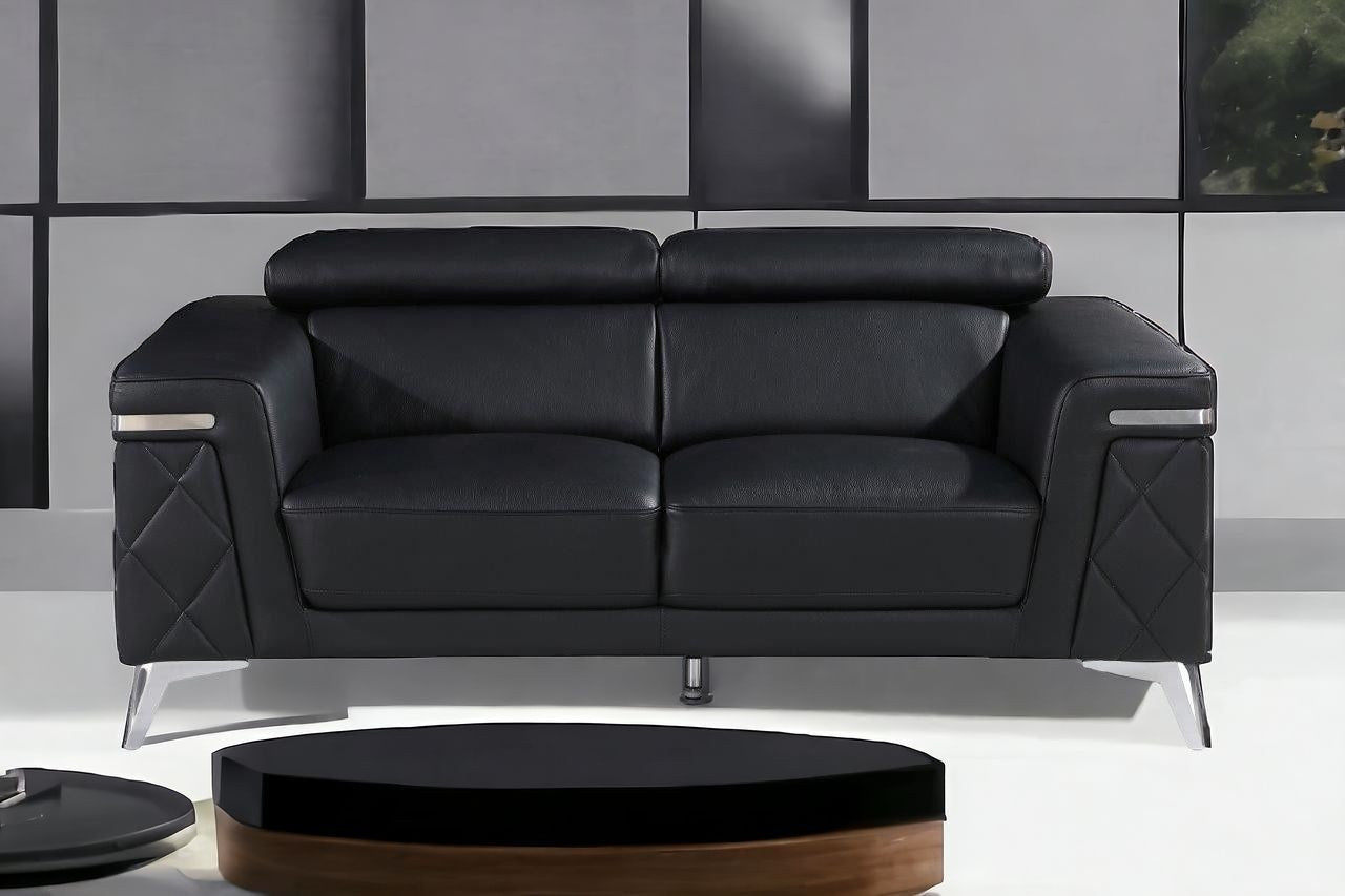 Made of top quality, supple leather, this 70-inch black and silver metallic leather loveseat will be the star of your space. The high grade premium leather used makes your lounging luxuriously comfortable and adds an elegant appeal to your space. Square arms offer a comfy place to rest and give this piece some interest and shape. Silver metallic steel legs effortlessly elevate the room and add a touch of contemporary design. A great showpiece for your room, this sofa is a must have. 38-inch H x 70-inch W x 42-inch D
