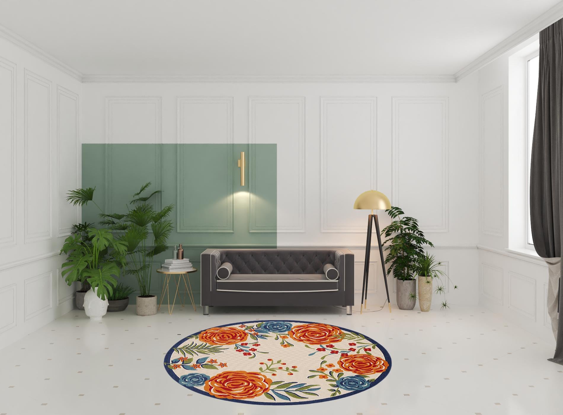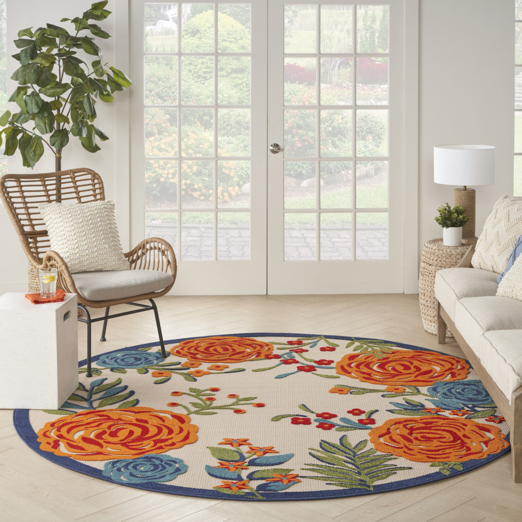 8' Blue and Orange Round Floral Power Loom Area Rug