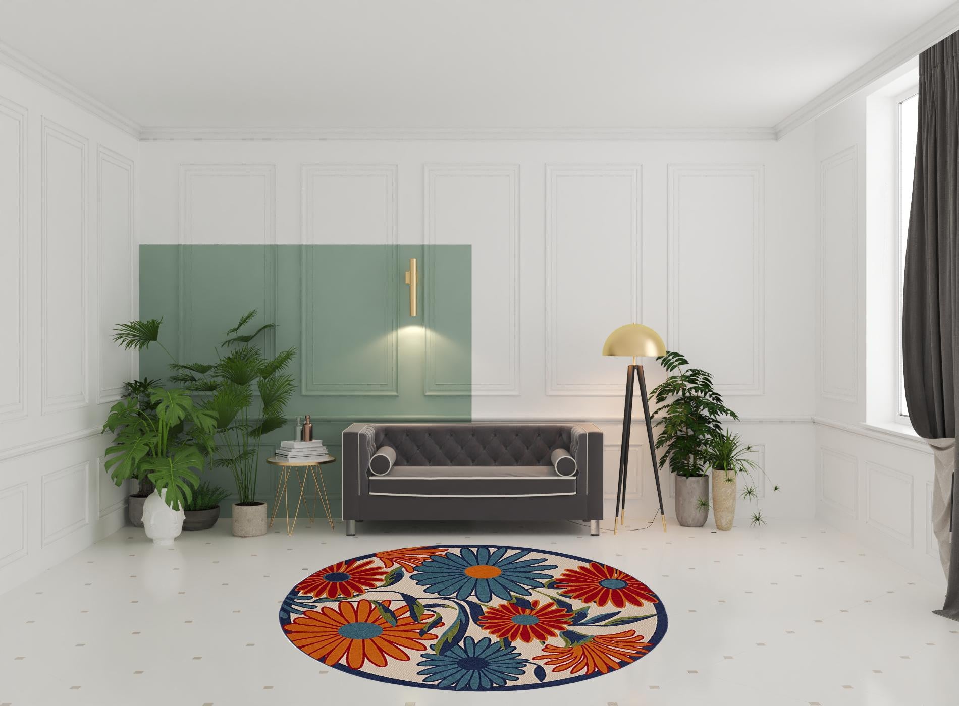 Set an inviting tone in your space with this 8' blue and orange round floral power loom area rug. This geometric round shaped rug features a floral pattern in blue and orange that combines a good looking print with a unique and updated shape. The mix of shape, color, and design gives this rug refreshing visual interest. This superior Turkish rug represents the highest quality and is built to last. Place this area rug against a hardwood or tile floor and it will enliven your living space with style and sophistication. .25" H x 94.00" W x 94.00" D