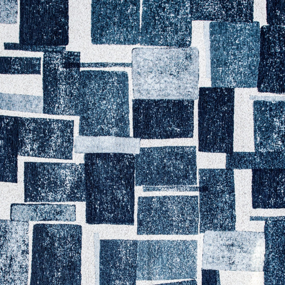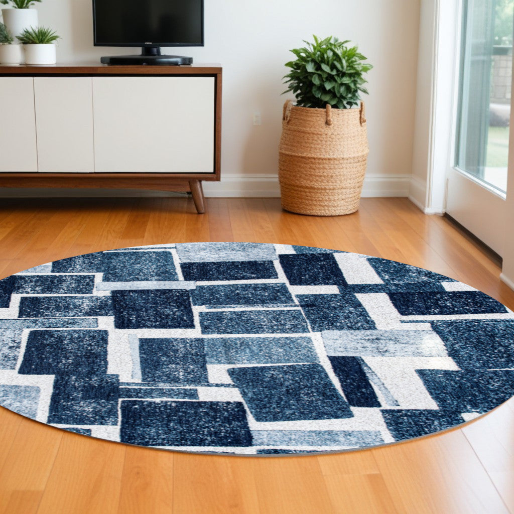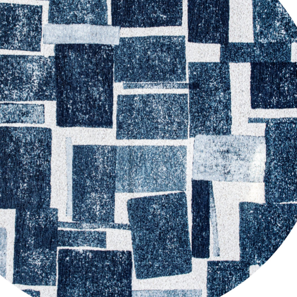 This 8-foot blue and white round geometric non skid area rug, is a great way to add warmth to a room. This geometric round shaped rug features a geometric pattern in blue and white that combines a good looking print with a unique and updated shape. The mix of shape, color, and design gives this rug refreshing visual interest. Area rugs help to give warmth and sense of home to your space. 84-inch H x 84-inch W x 0.2-inch D
