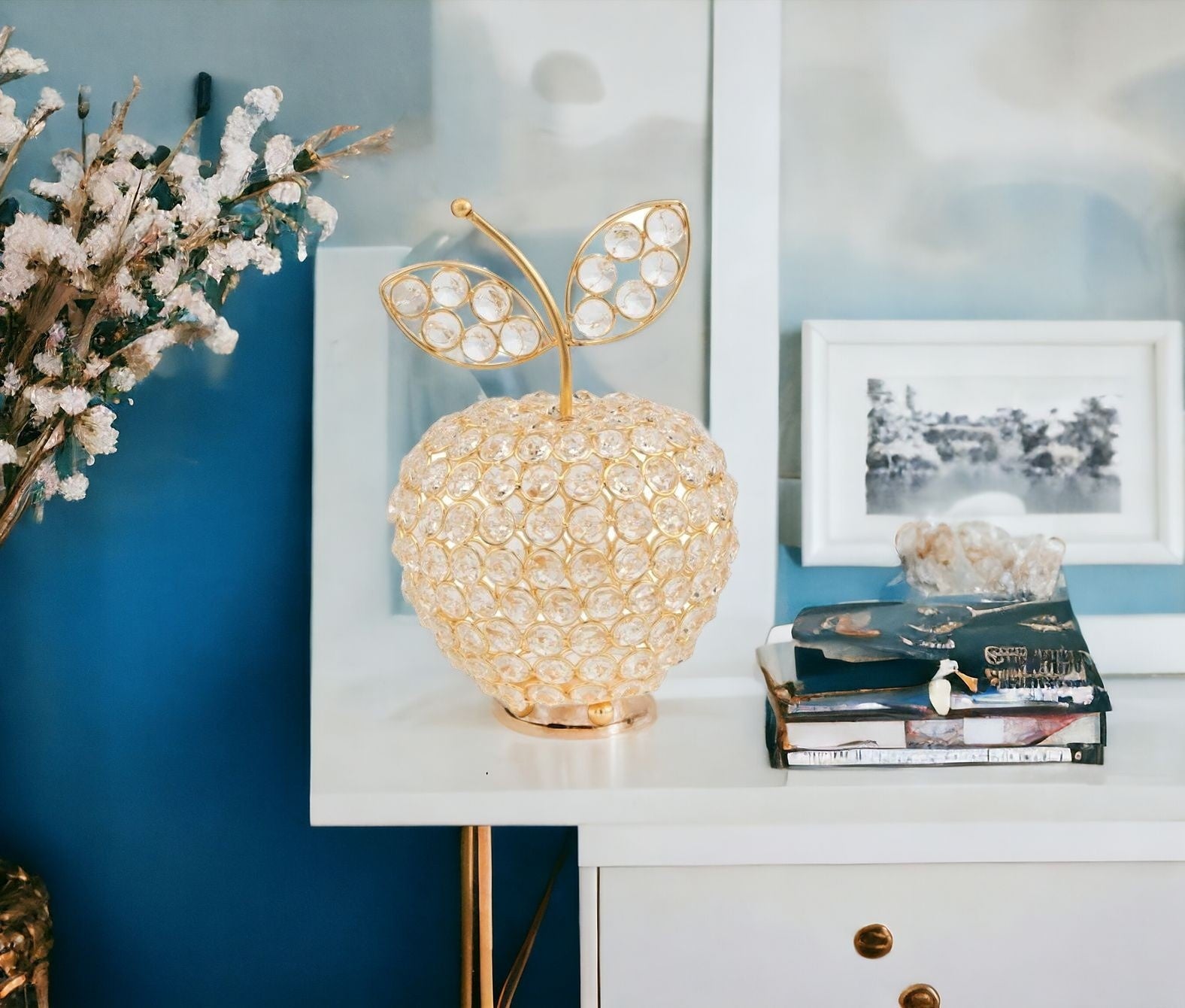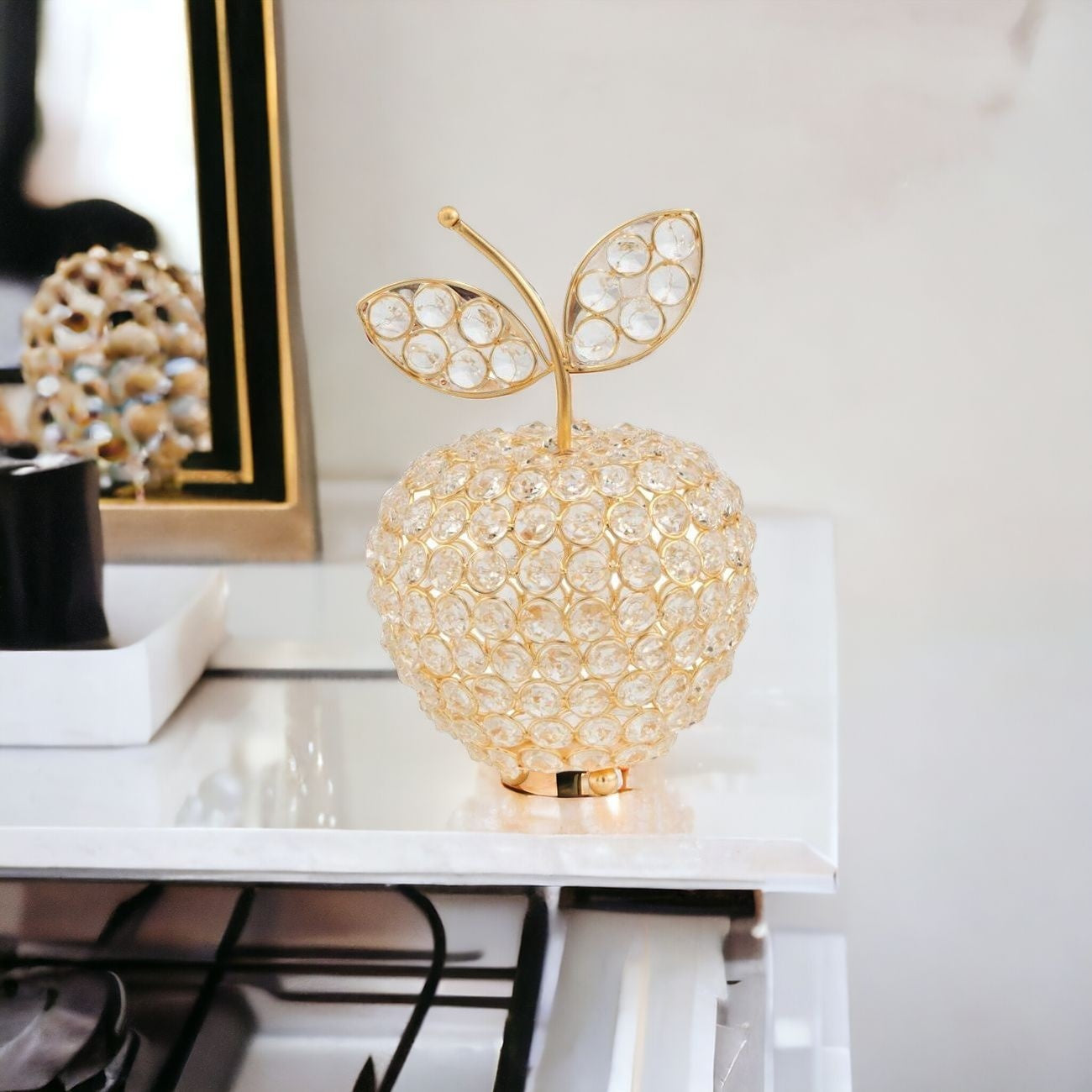 This 8-inch gold and clear faux crystal and aluminum decorative apple will add a beautiful decorative accent to your decor. This gold and clear colored piece is made from high grade faux crystal and aluminum. Great to use on its own or mix with other decorations for the perfect look. 8-inch H x 5.5-inch W x 5.5-inch D