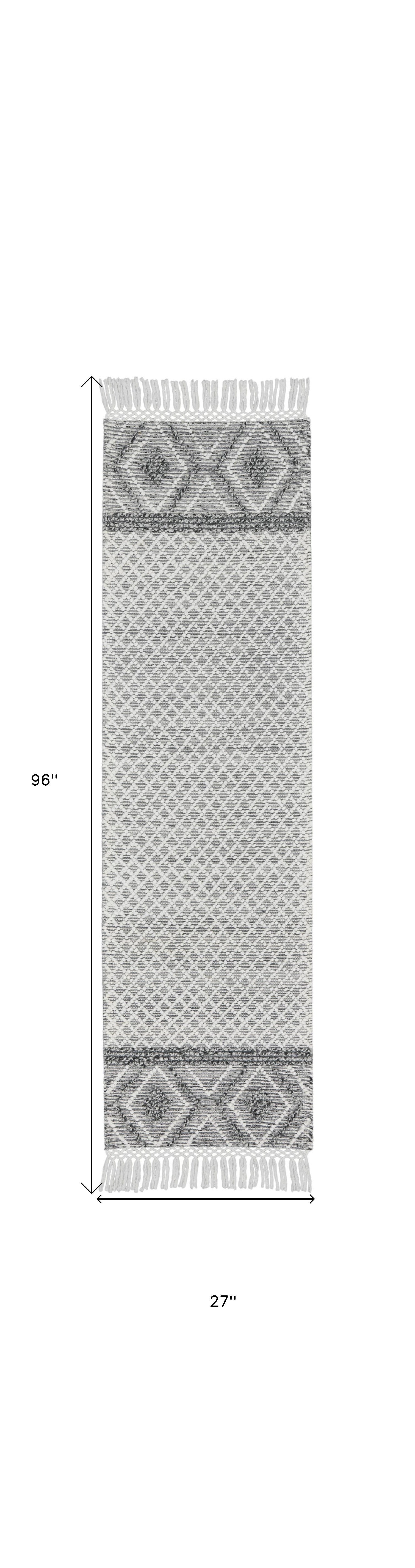 8' Gray and Ivory Geometric Hand Woven Runner Rug With Fringe