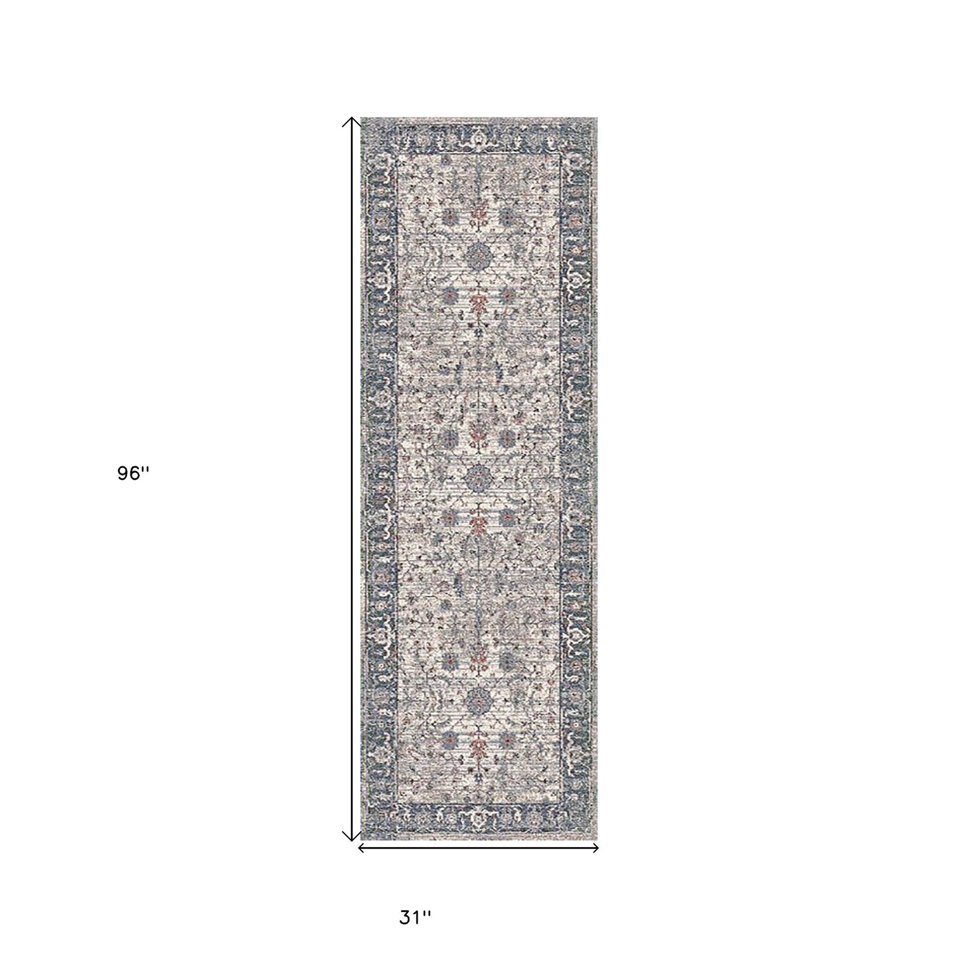 8' Gray and Ivory Oriental Power Loom Runner Rug