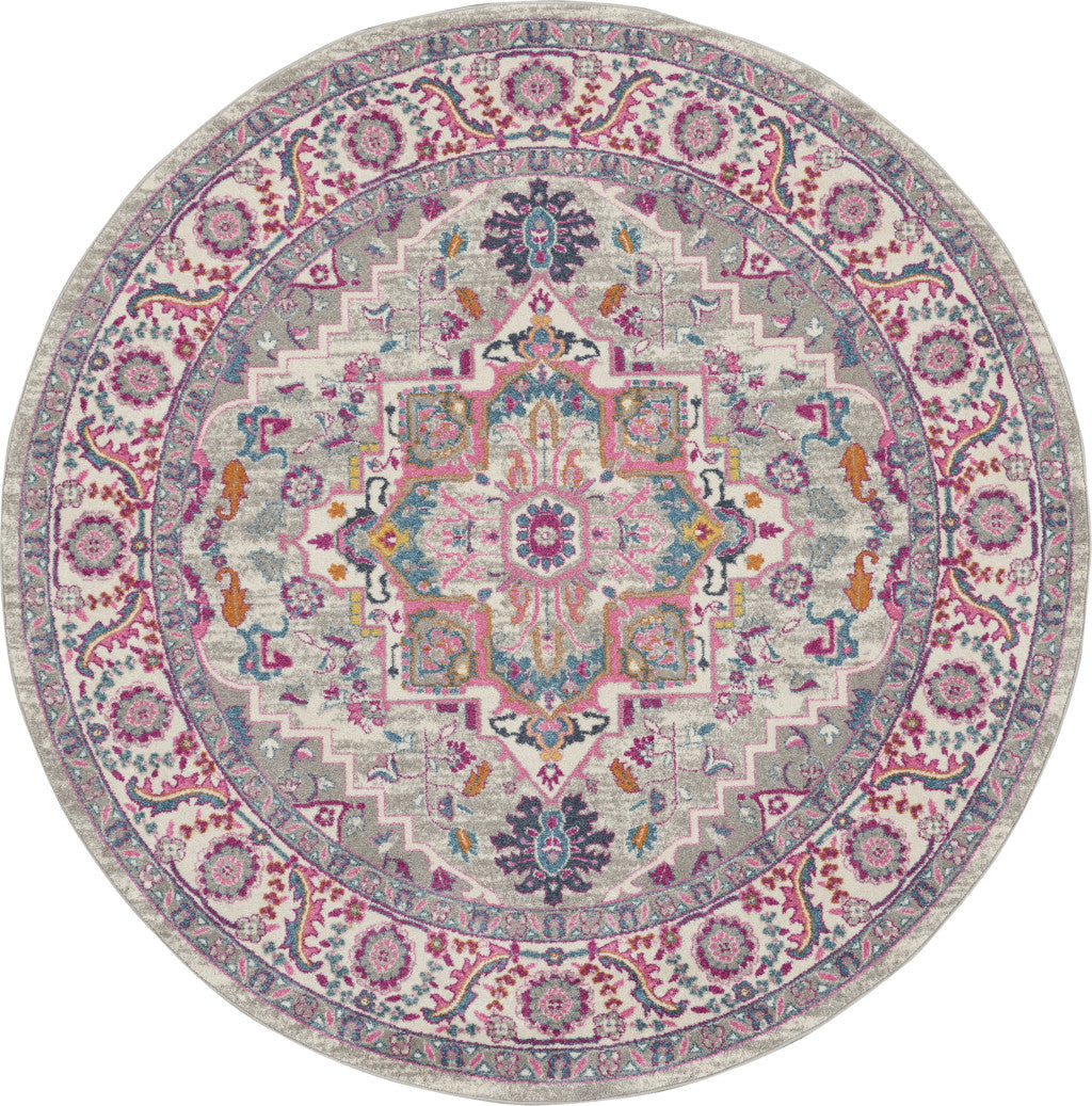 Set an inviting tone in your space with this 8' gray round floral power loom area rug. This geometric round shaped rug features a floral pattern in gray that combines a good looking print with a unique and updated shape. The mix of shape, color, and design gives this rug refreshing visual interest. The coloring of this rug adds a delightfully neutral tone to your home and will easily match with most any decor. Made in Turkey, this rug offers high quality combined with good looking designer sensibilities. Place this area rug against a hardwood or tile floor and it will enliven your living space with style and sophistication. .50" H x 96.00" W x 96.00" D