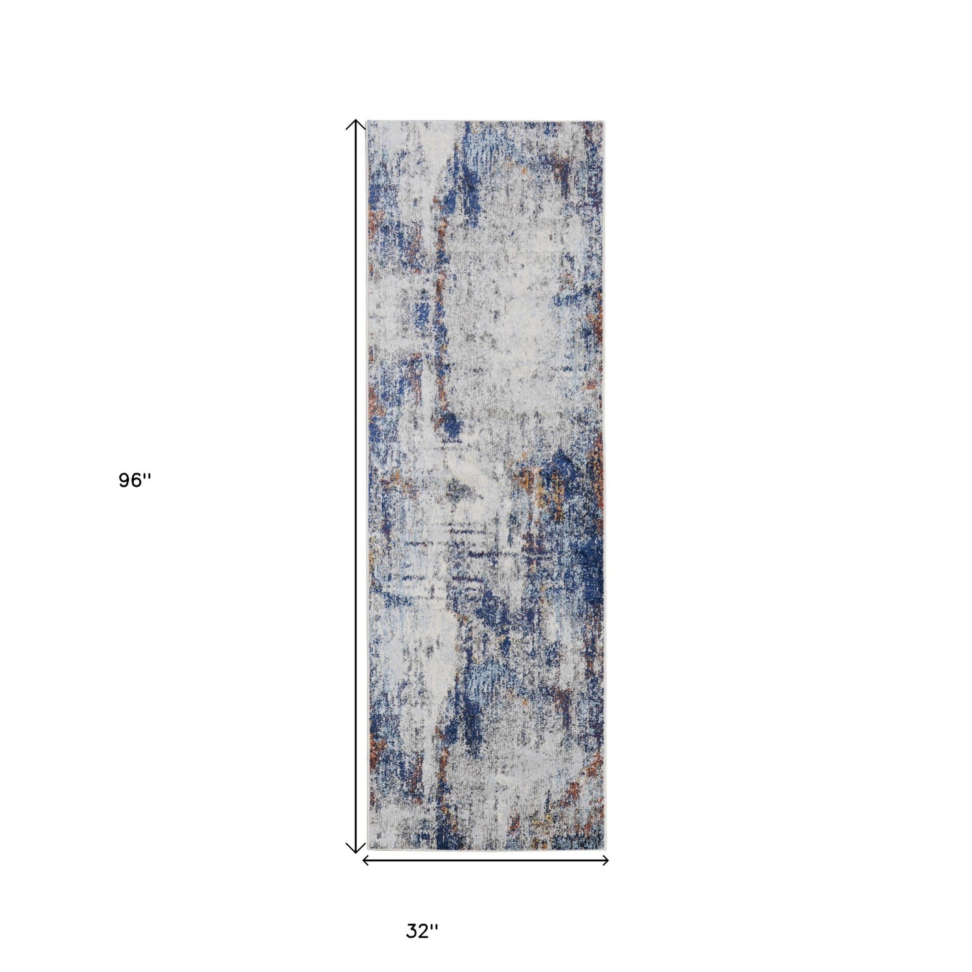 8' Ivory and Blue Abstract Power Loom Distressed Runner Rug