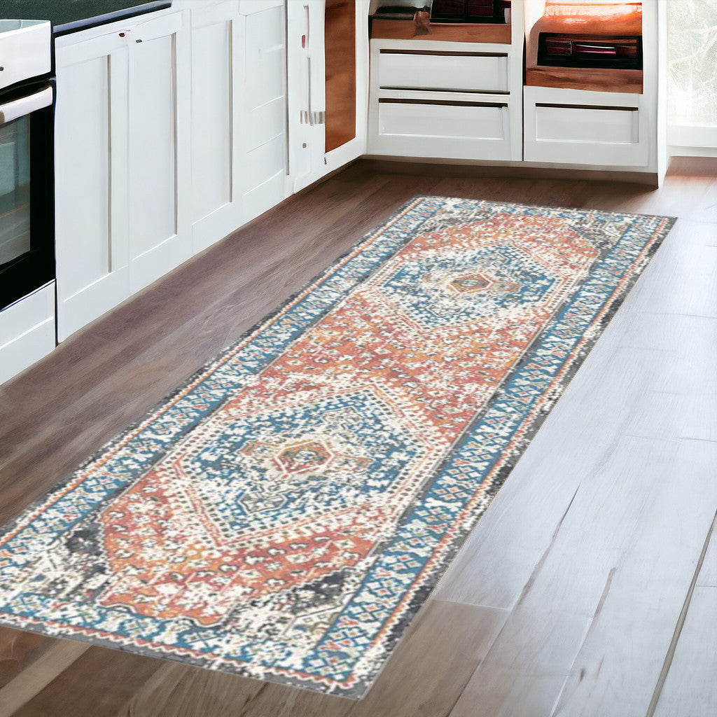 8' Teal Taupe and Rust Geometric Distressed Runner Rug With Fringe