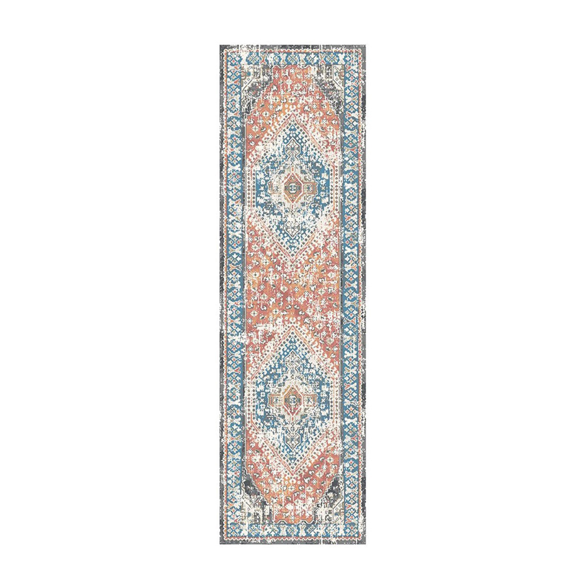 Set an inviting tone in your space with this 8-foot teal taupe and rust geometric distressed runner rug with fringe. This runner shaped rug features a geometric design in teal taupe and rust to give it visual interest. A classic shape marries with good looking design for your space ideal for spaces with kids and pets, this rug is stain resistant to help repel stains and spilled liquids. Tassel ends bring a timeless and fashionable look to your interior. Area rugs help to give warmth and sense of home to your space. 25-inch H x 89-inch W x 0.39-inch D