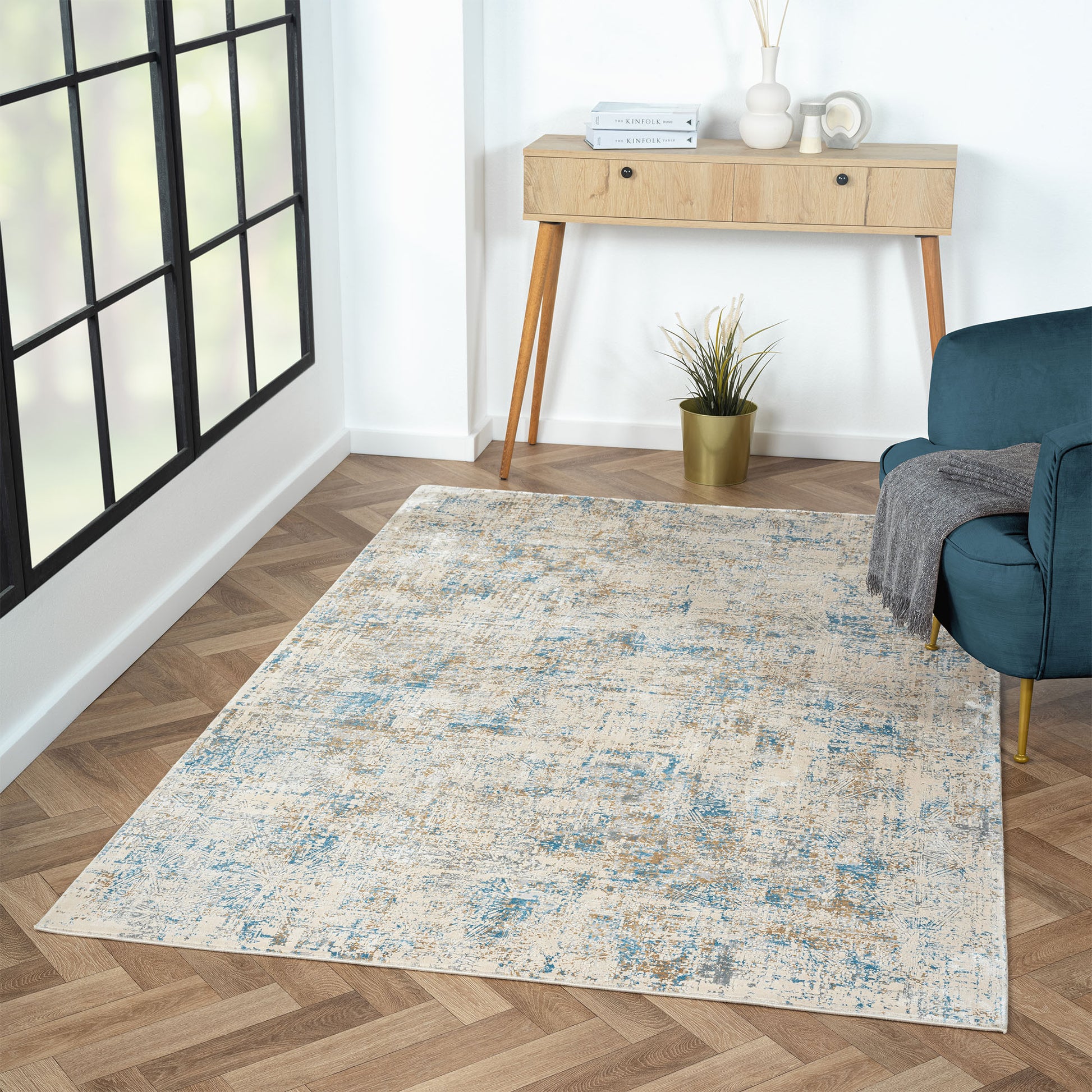 Set an inviting tone in your space with this 8-foot x 10-foot blue and ivory abstract area rug. This rectangle shaped rug features a abstract design in blue and ivory to give it visual interest. A classic shape marries with good looking design for your space area rugs help to give warmth and sense of home to your space. 93-inch H x 118-inch W x 0.26-inch D