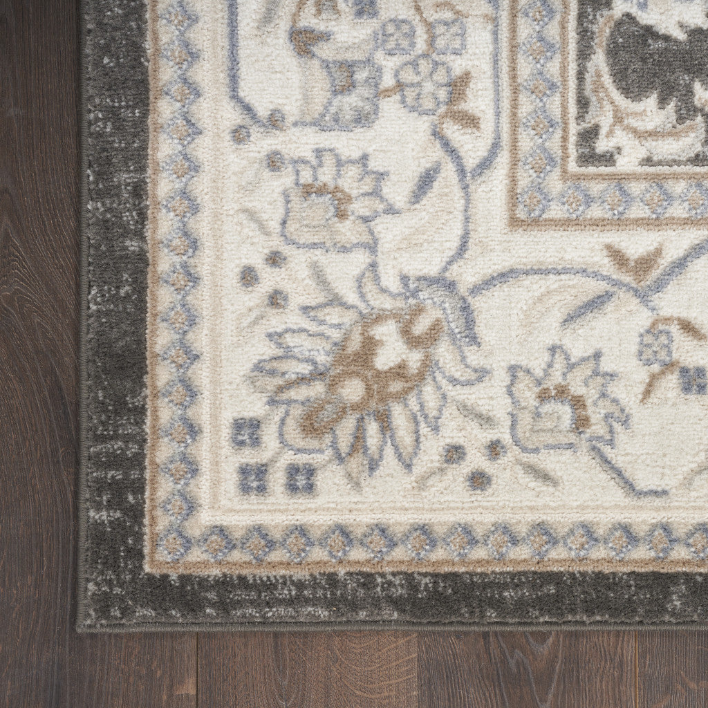 This 8-foot x 10-foot gray floral distressed area rug, is a great way to add warmth to a room. This rectangle shaped rug features a floral design in gray to give it visual interest. A classic shape marries with good looking design for your space the coloring of this rug adds a delightfully neutral tone to your home and will easily match with most any decor. Area rugs help to give warmth and sense of home to your space. 94-inch H x 118-inch W x 0.35-inch D