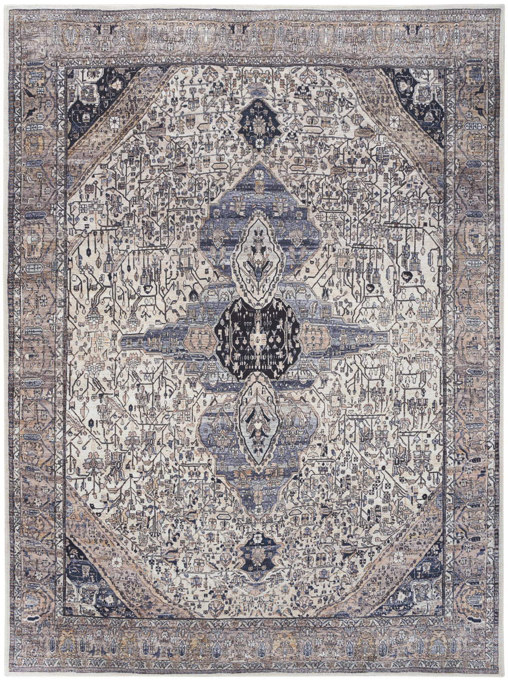 This 8-foot x 10-foot ivory and blue oriental power loom distressed washable non skid area rug, is a great way to add warmth to a room. This rectangle shaped rug features a oriental design in ivory and blue to give it visual interest. A classic shape marries with good looking design for your space Place this area rug against a hardwood or tile floor and it will enliven your living space with style and sophistication. .25-inch H x 94.00-inch W x 118.00-inch D