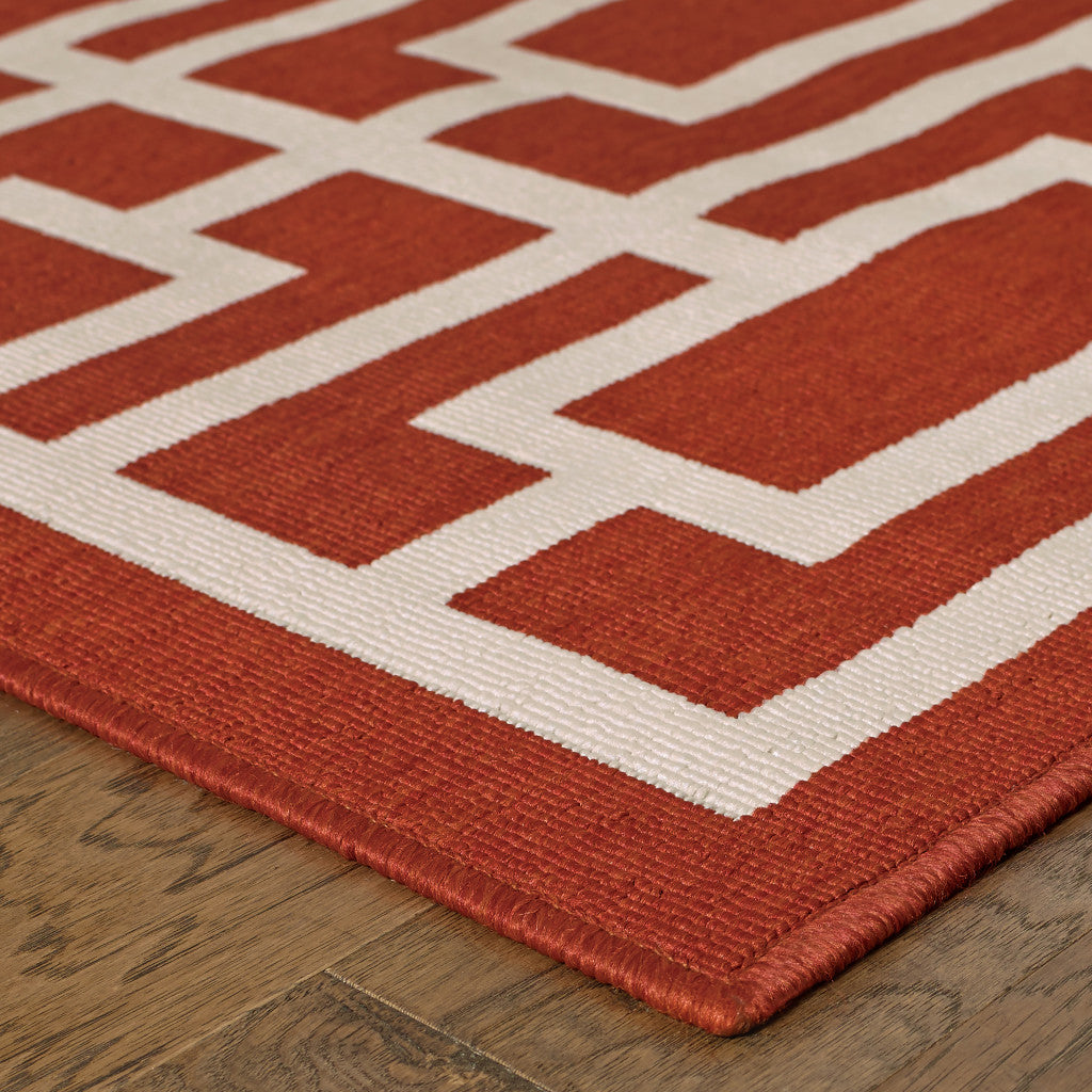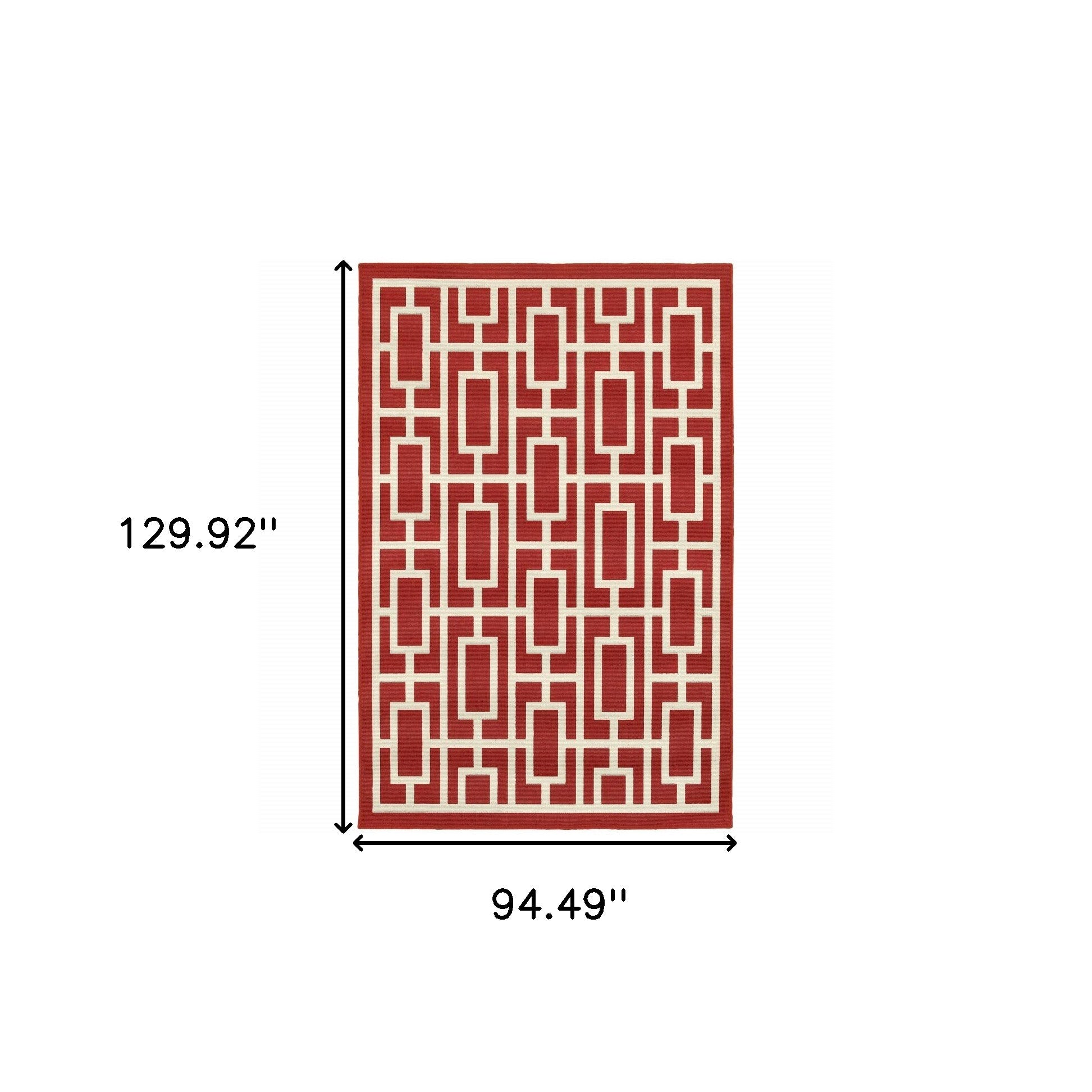 8' x 11' Red and Ivory Geometric Stain Resistant Indoor Outdoor Area Rug
