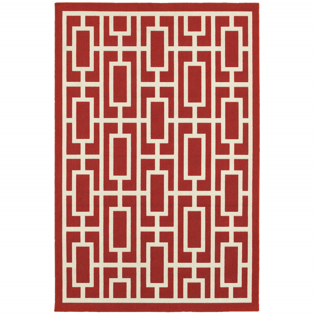 Set an inviting tone in your space with this 8-foot x 11-foot red and ivory geometric stain resistant indoor outdoor area rug. This rectangle shaped rug features a geometric design in red and ivory to give it visual interest. A classic shape marries with good looking design for your space Ideal for spaces with kids and pets, this rug is stain resistant to help repel stains and spilled liquids. Place this area rug against a hardwood or tile floor and it will enliven your living space with style and sophistication. 0.15-inch H x 94.49-inch W x 129.92-inch D