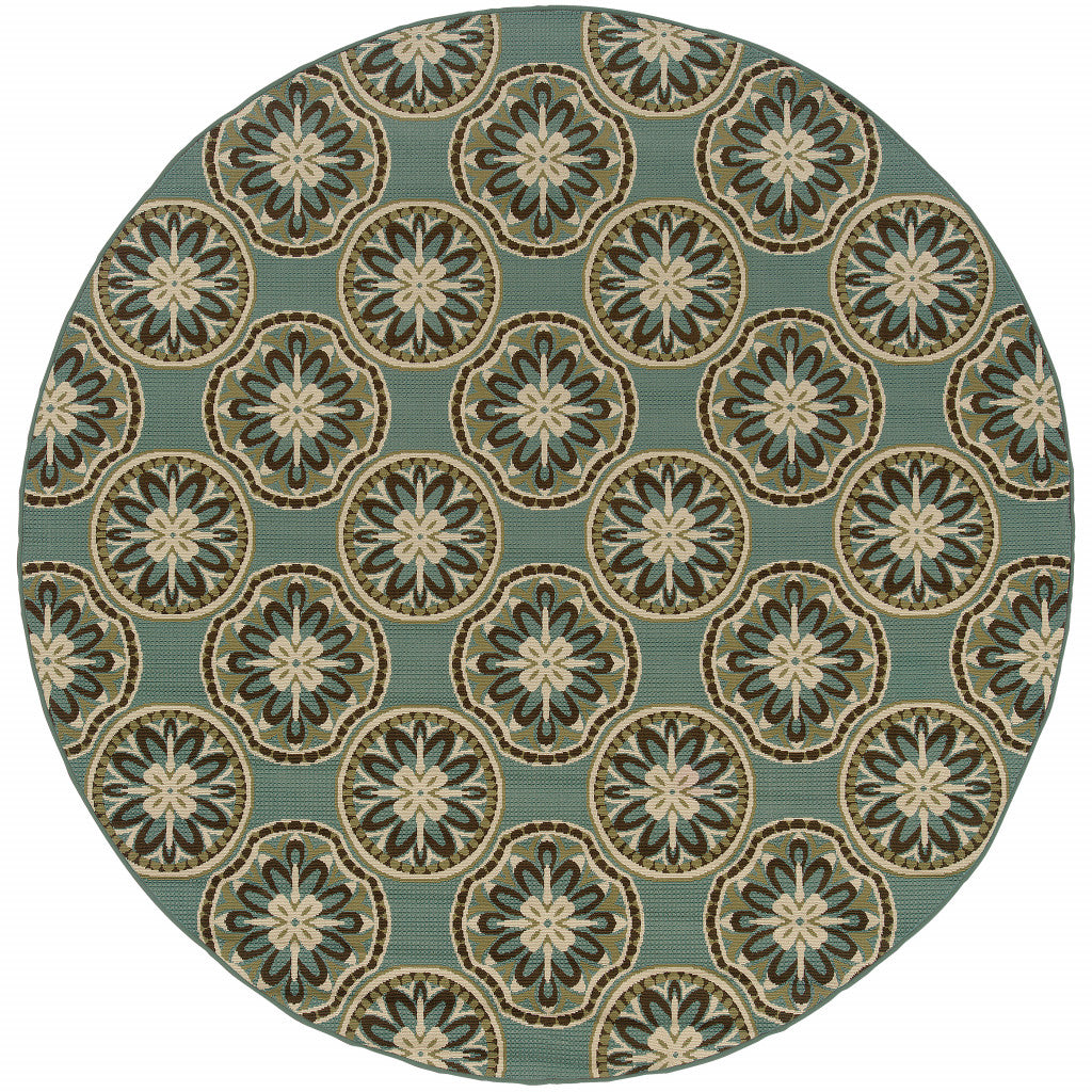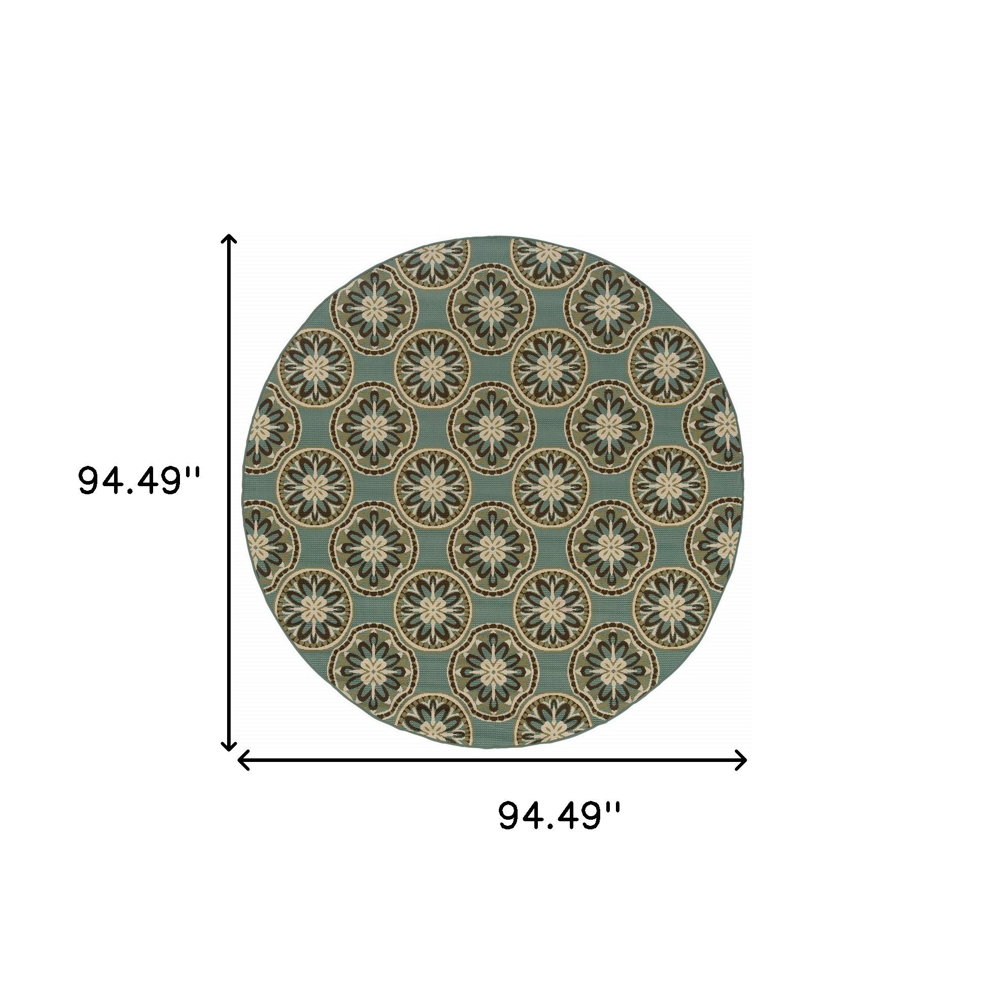 8' x 8' Blue and Ivory Round Floral Stain Resistant Indoor Outdoor Area Rug
