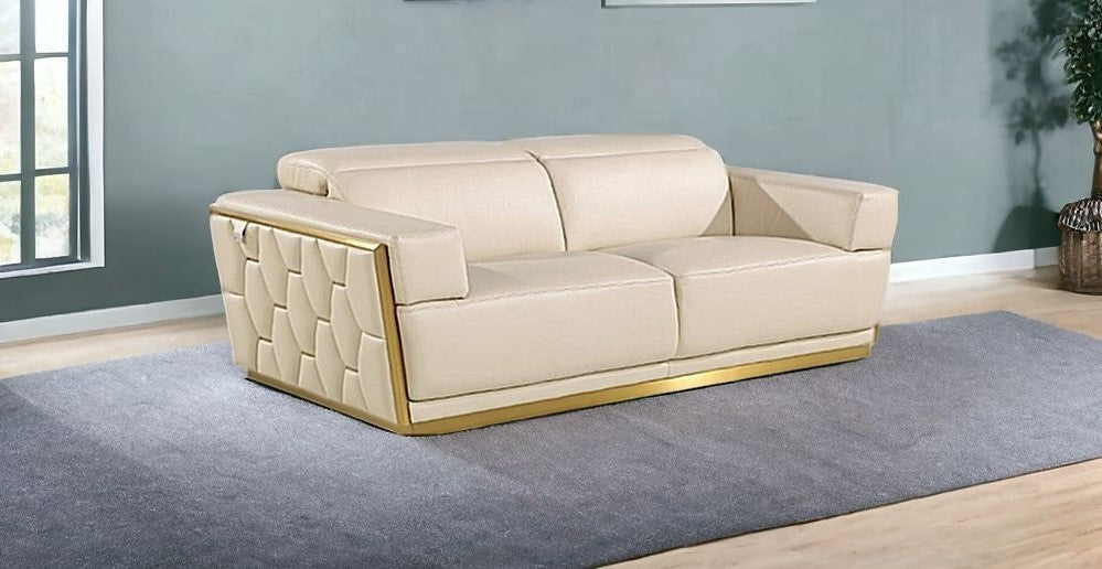Superior construction from fabulously soft and high grade Italian leather gives this 89-inch beige and gold leather sofa a leg up on the competition. The premium leather makes your lounging luxuriously comfortable and adds an elegant appeal to your space. The wide arms offer a comfy place to rest, while the tufted stitching on the sides brings in a hint of art deco design sense. Finished off with gold trim that creates a contemporary chic color combination. A great showpiece for your room, this sofa is a must have. 40-inch H x 89-inch W x 43-inch D
