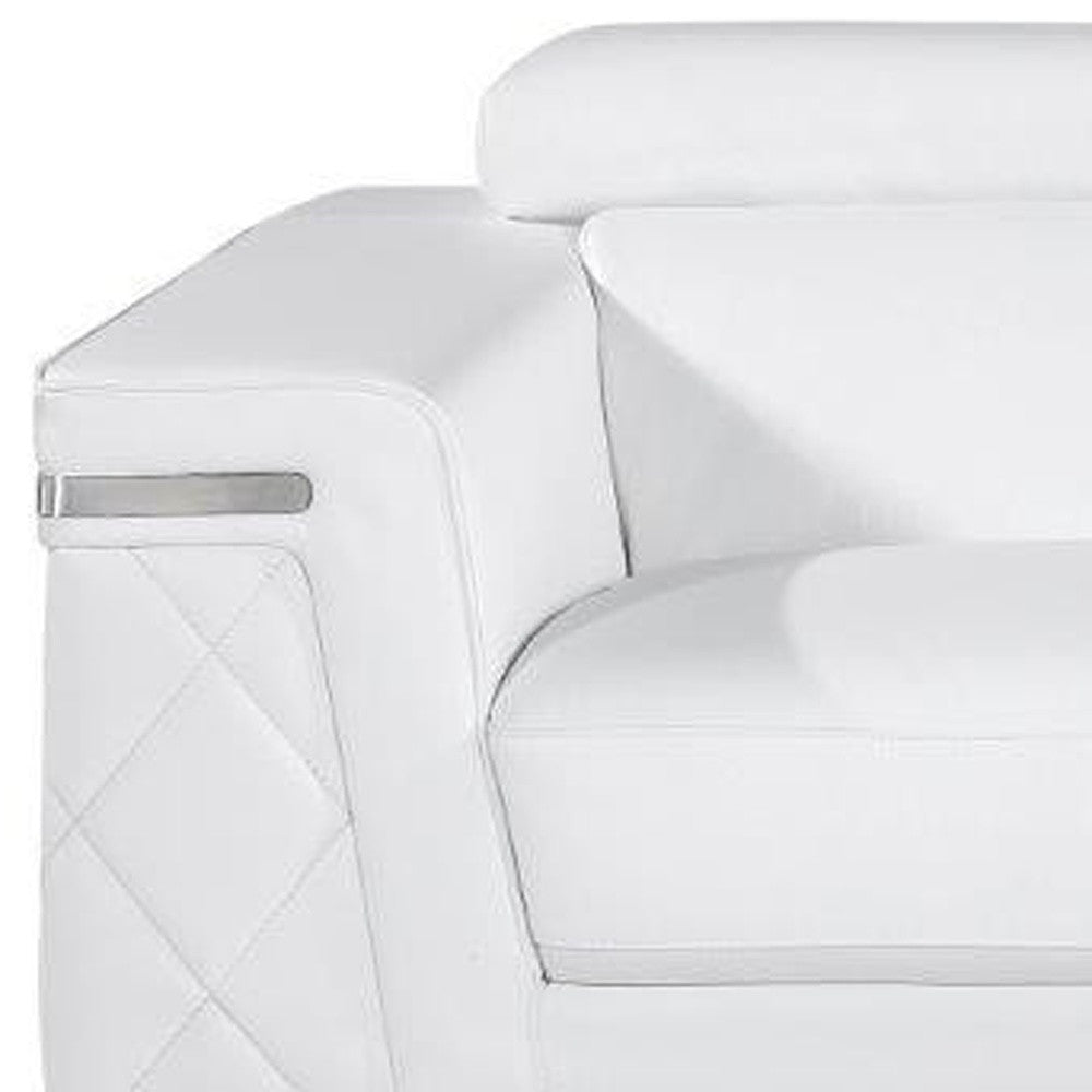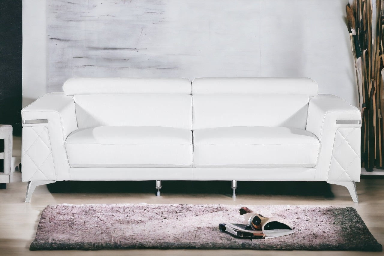 An interior designer's dream, this buttery soft high grade leather 89-inch white and silver italian leather sofa will bring just the right touch to your space. The premium leather used makes your lounging luxuriously comfortable and adds an elegant appeal to your space. Solid colors give you lots of decorative options and are easy to work into your decor scheme. Sinuous springs construction gives this piece strong support and makes it comfortable to sit even for long periods of time. Square arms offer a comfy place to rest. Silver stainless steel legs effortlessly elevate the room and add a touch of contemporary design. Built to last, this sofa will be a great centerpiece for your room. 42-inch H x 89-inch W x 38-inch D