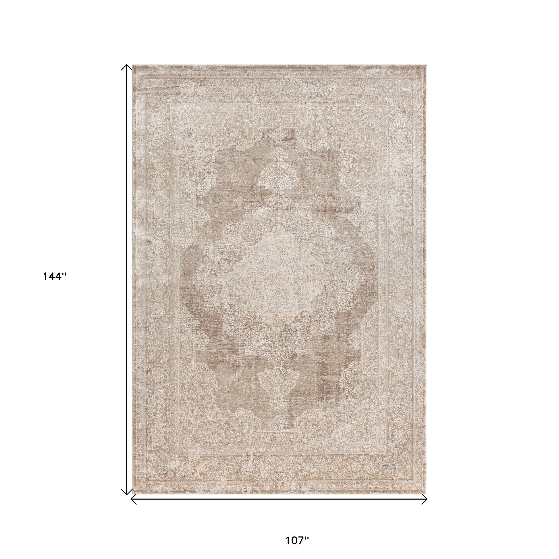 This 9-foot x 12-foot beige and ivory medallion area rug, is a great way to add warmth to a room. This rectangle shaped rug features a medallion design in beige and ivory to give it visual interest. A classic shape marries with good looking design for your space place this area rug against a hardwood or tile floor and it will enliven your living space with style and sophistication. 107-inch H x 144-inch W x 0.26-inch D