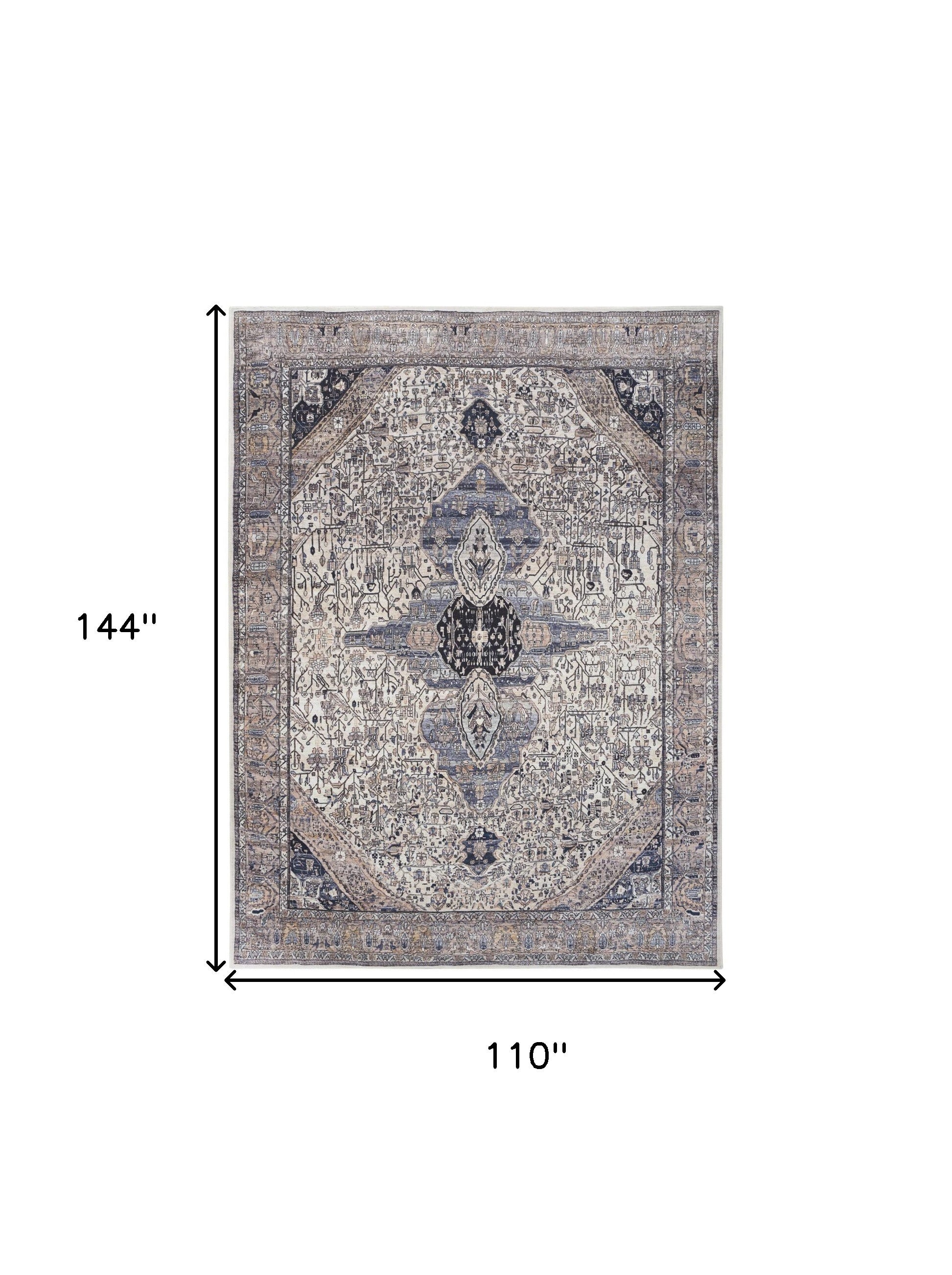 9' x 12' Ivory and Blue Oriental Power Loom Distressed Washable Non Skid Area Rug