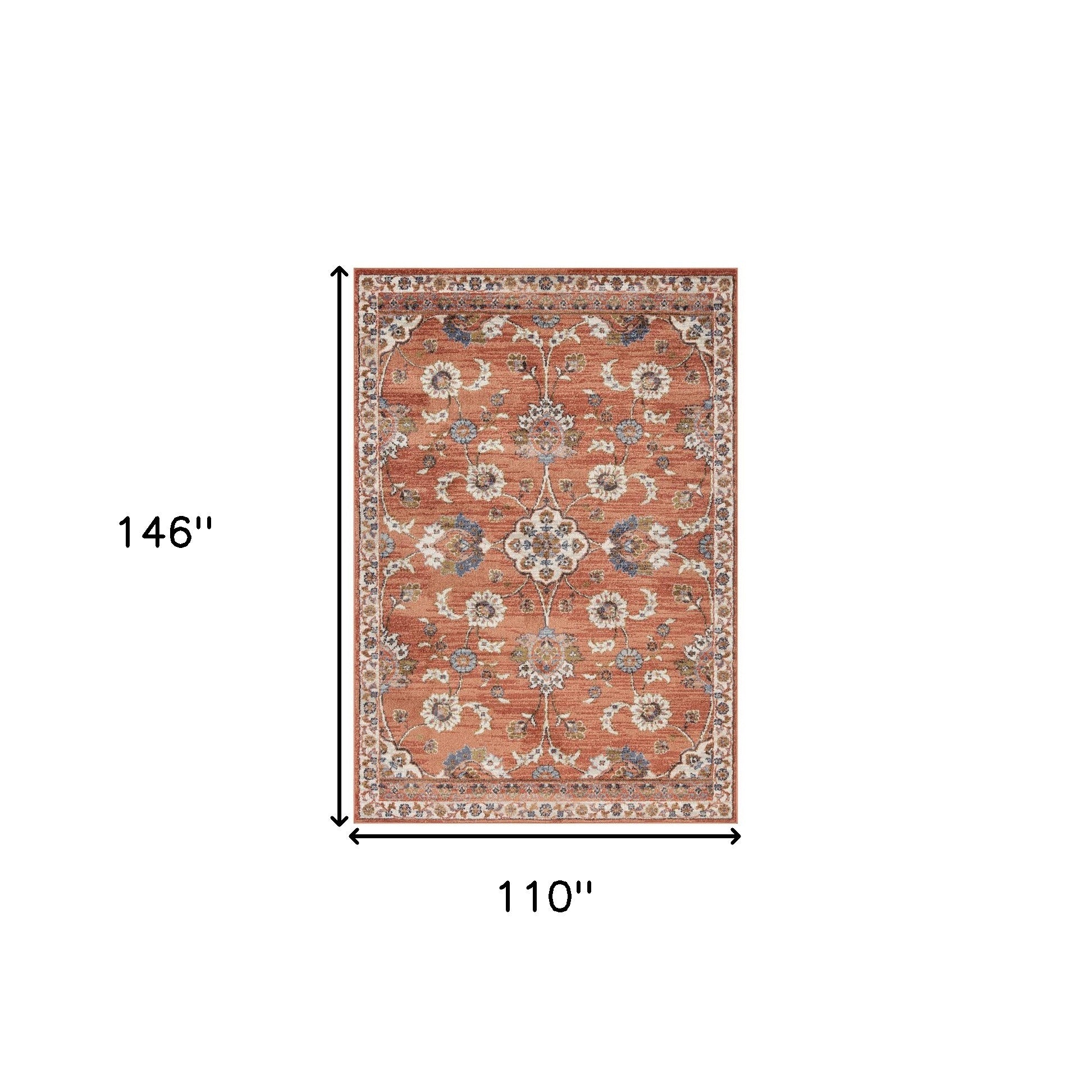 Add some artistry to your room with this 9-foot x 12-foot orange floral power loom area rug. This rectangle shaped rug features a floral design in orange to give it visual interest. A classic shape marries with good looking design for your space Ideal for spaces with kids and pets, this rug is stain resistant to help repel stains and spilled liquids. Area Rugs help to give warmth and sense of home to your space. 0.4-inch H x 110-inch W x 146-inch D